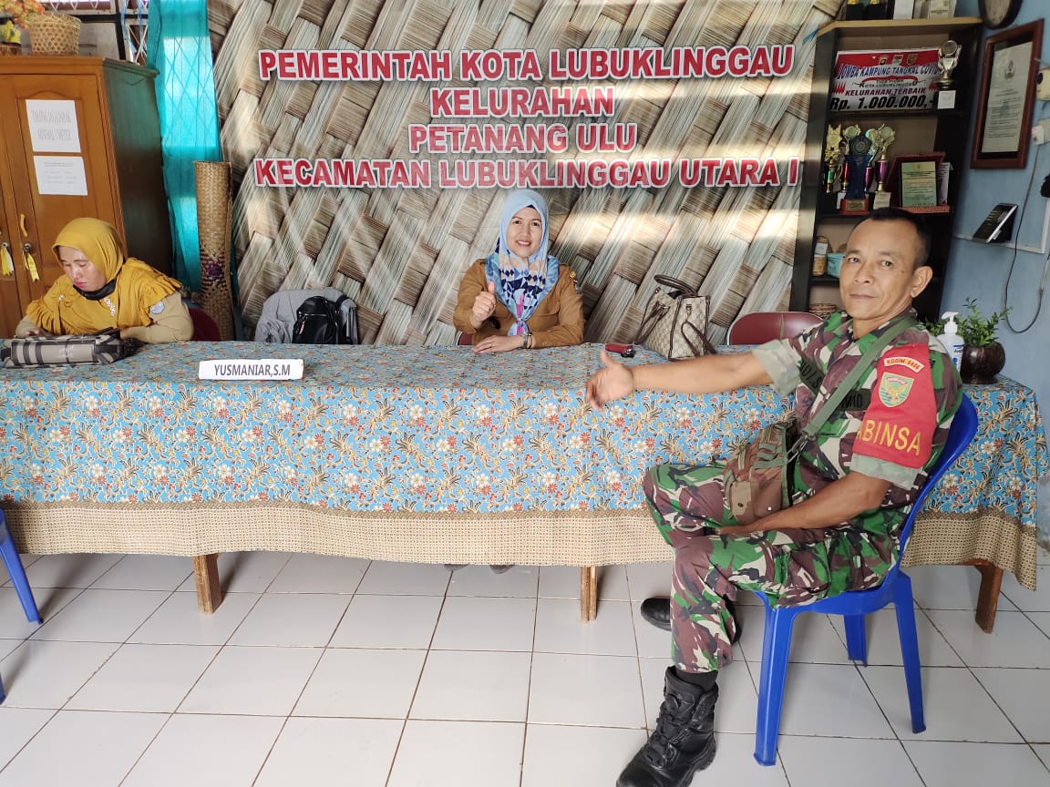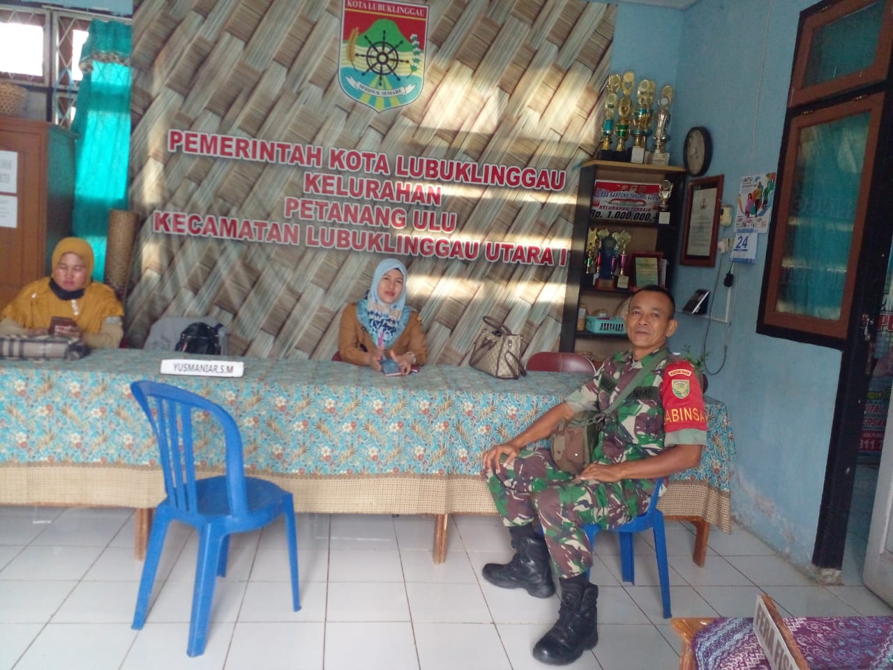 Babinsa Koramil 406-08/Kita Lubuklinggau Kodim 0406/Lubuklinggau Sertu Yudi Santoso mengawali kegiatan paginya dengan melakukan Komsos dengan Staf Kelurahan bertempat di Kelurahan Petanang Ulu Kecamatan Lubuklinggau Utara 1 Kota Lubuklinggau,Selasa (06/09/2022).