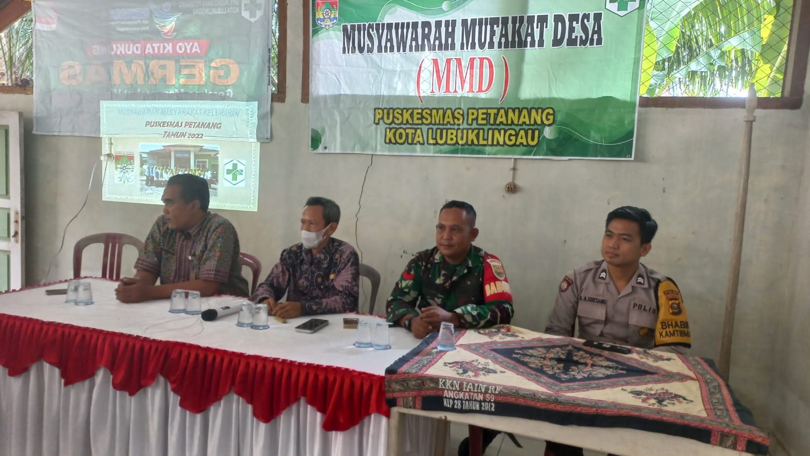 Babinsa Koramil 406-08/Kota Lubuklinggau Kodim 0406/Lubuklinggau Koptu Wahyu Budi Utomo menghadiri kegiatan Rapat Musyawarah Mufakat Desa yang bertempat di Balai Puskesmas Petanang Kecamatan Lubuklinggau Utara 1 Kota Lubuklinggau, Kamis (08/09/2022).