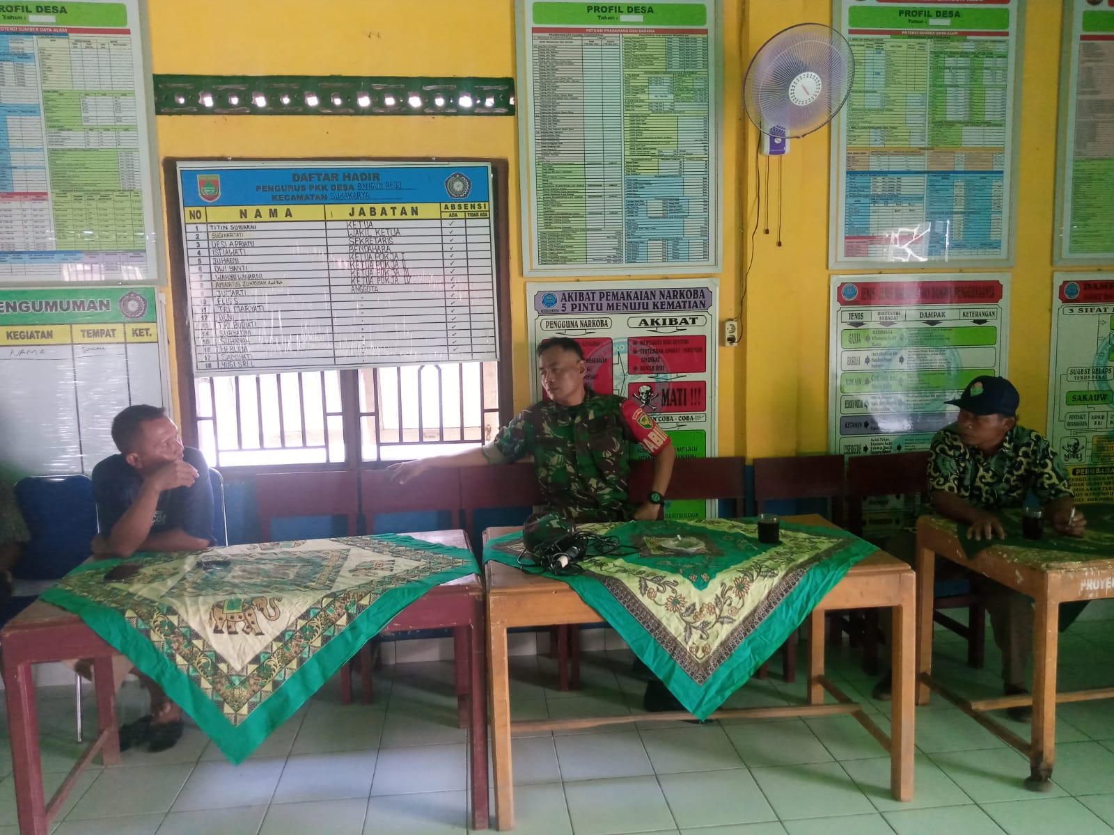 “ Sengaja saya lakukan komunikasi dan koordinasi dengan pemerintah desa, harapannya dengan adanya saling koordinasi dan komunikasi dapat memecahkan suatu permasalahan ” ujar Babinsa.