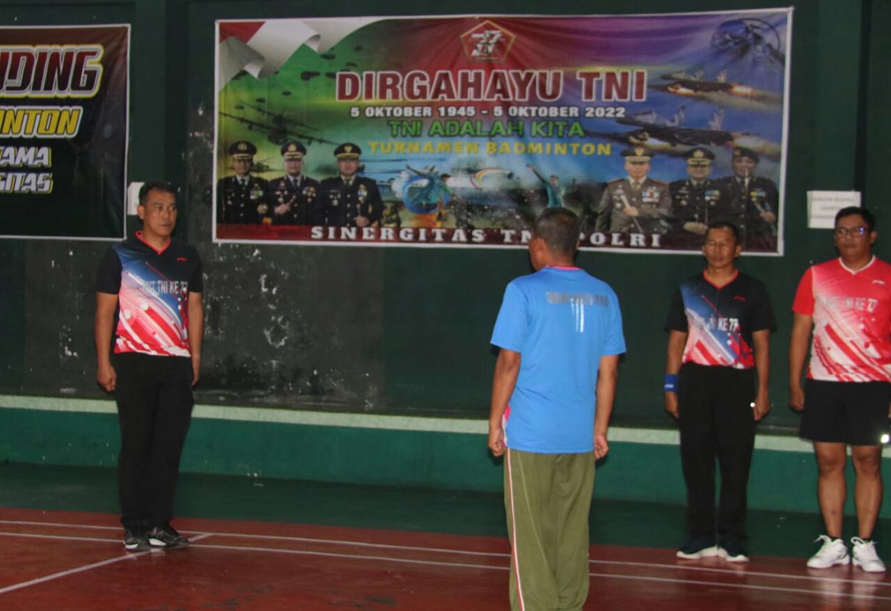 Lensa Garuda- Lubuklinggau, Bertempat di Gedung Bulu tangkis H. Neldian Jl Watervang, Kecamatan. Lubuklinggau Timur I, Kota Lubuklinggau dilaksanakan kegiatan Pembukaan Turnamen Perlombaan Badminton Sinergitas TNI – POLRI dalam Memperingati HUT TNI ke 77 Kodim 0406/Lubuklinggau. Rabu (12/10/2022).