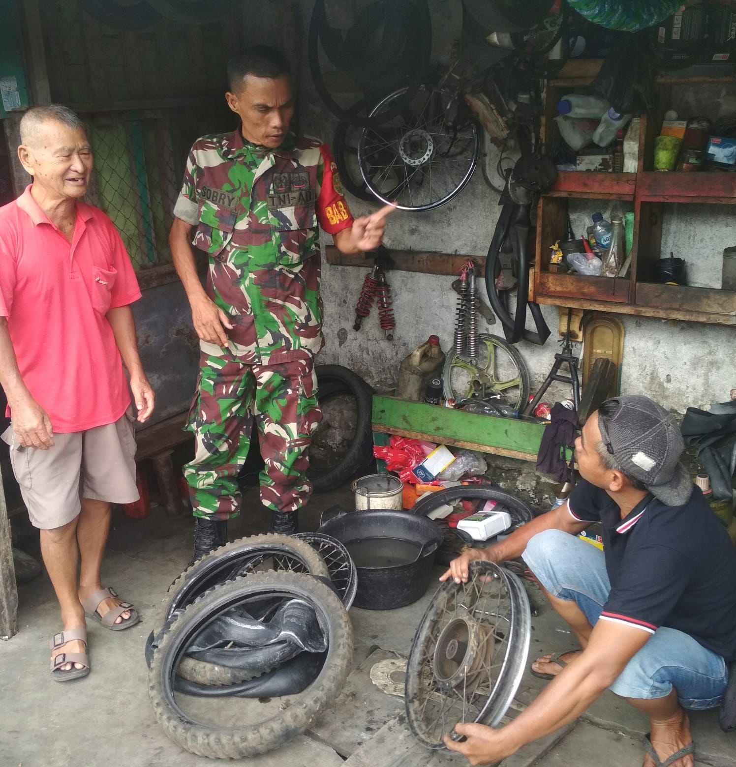 Babinsa Kelurahan Ulak Lebar Koptu Sobri melaksanakan komsos di bengkel tambal ban serta jual ban RT 03 Kelurahan Ulak Lebar Kecamatan Lubuklinggau Barat II Kota Lubuklinggau,Selasa. (25/10/2022).
