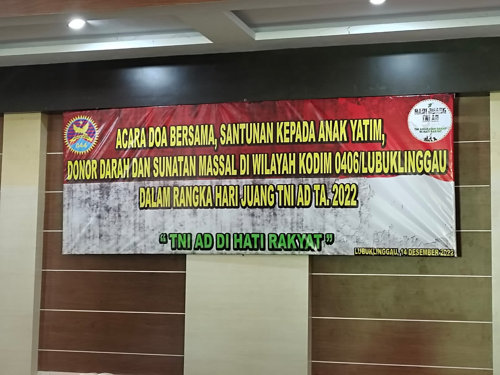 Lensa Garuda- Lubuklinggau , Bertempat di Aula Pamungkas Makodim Jl. Garuda Kelurahan Tanjung Indah Kecamatan Lubuklinggau Barat 1 Kota Lubuklinggau Kodim 0406/Lubuklinggau di Pimpin oleh Dandim Letkol Arm Anggeng Prasetyo Sulistyono S.E dalam rangka hari Juang Kartika TNI AD ke 77 tahun 2022 menggelar kegiatan Acara Doa bersama, Santunan kepada anak yatim, Donor darah dan Sunatan massal. Rabu(14/12/2022).