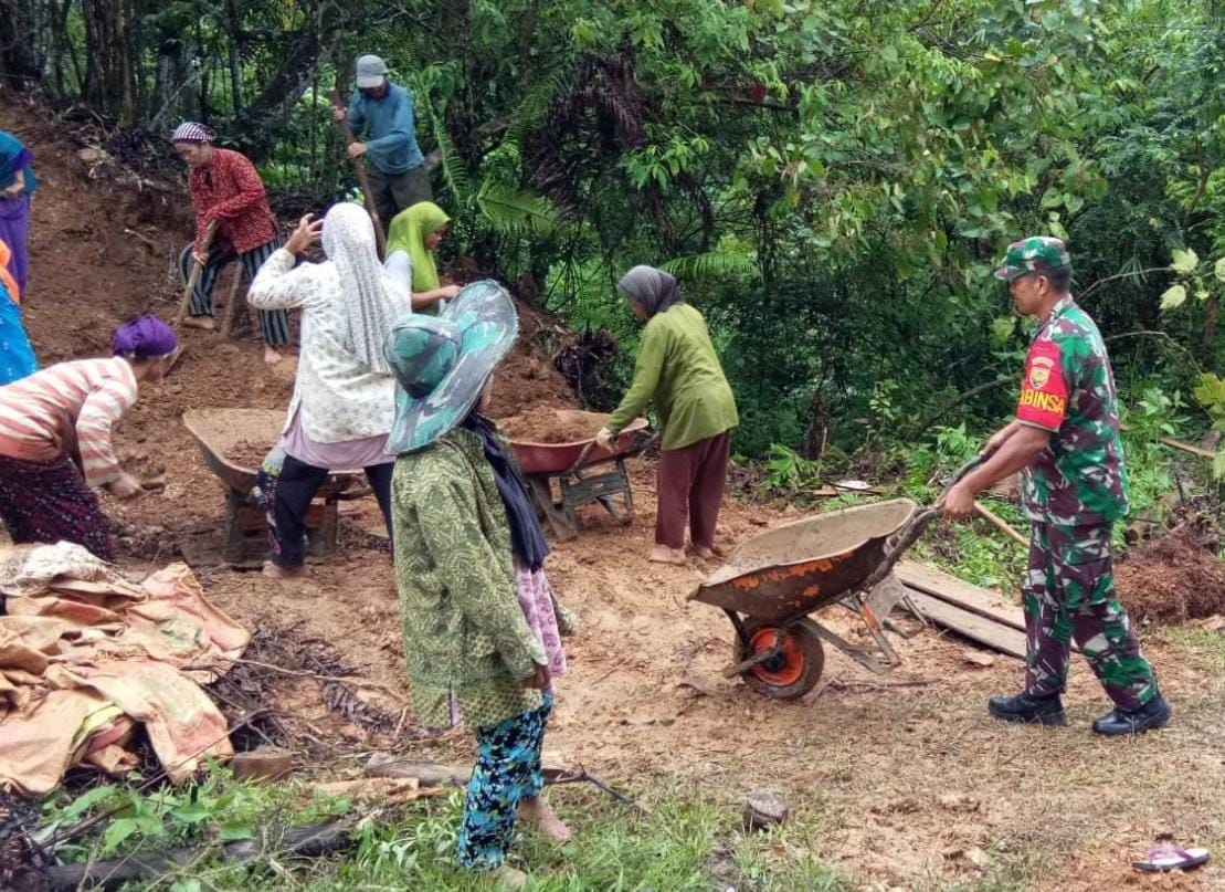 Babinsa Koramil 406-01/Rawas ulu Kodim 0406/Lubuklinggau Serda Musliadi bersama warga masyarakat melaksanakan kegiatan kerja bakti sosial membersihkan jalan dan parit di Desa teladas kecamatan Rawas ulu Kabupaten Musi Rawas Utara,(Muratara ), Sabtu (31/12/2022).