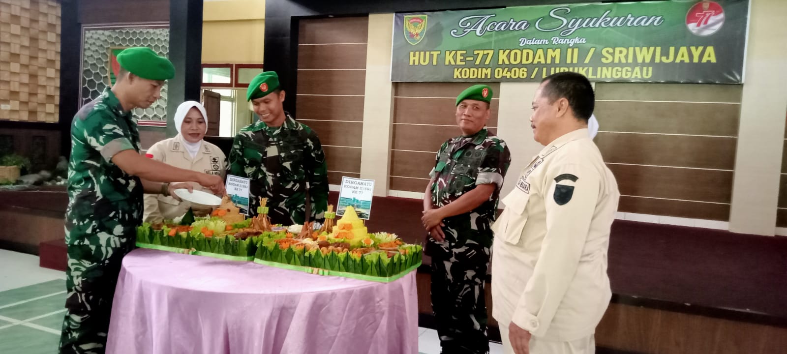 Hadir dalam Acara Syukuran dalam rangka HUT Ke 77 Kodam II/Swj di Kodim 0406/Lubuklinggau antara lain Dandim 0406/Lubuklinggau diwakili Kasdim 0406/Lubuklinggau Mayor Inf Nur Sigit Prasetya S.I.P.,M.Sc., Para Perwira Staf dan Danramil Jajaran Kodim 0406/Lubuklinggau, Para Bintara dan tamtama Kodim 0406/Lubuklinggau, serta Seluruh PNS Kodim 0406/Lubuklinggau.