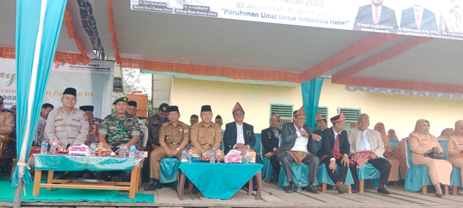 Serka Rusli Koramil 406-01/Rawas Ulu Kodim 0406/Lubuklinggau Menghadiri Peringatan hari amal bakti Kementerian Agama RI ke 77 Tahun 2023 yang bertema Hari Amal Bhakti Kemenag 2023 adalah “Kerukunan Umat untuk Indonesia Hebat”.Bertempat di lapangan MTs Negeri 1 Desa Lesung Batu Kecamatan Rawas Ulu Kabupaten Musi Rawas Utara, Selasa (03/01/2023).