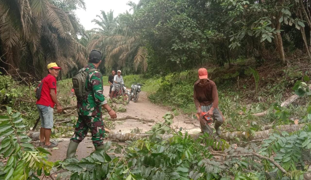 Babinsa Bersama Warga Gotong Royong Bersihkan Jalan akibat pohon yang tumbang