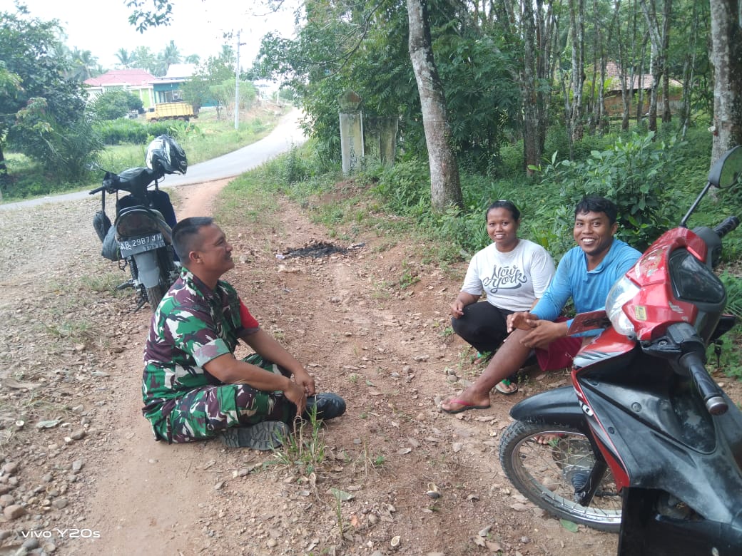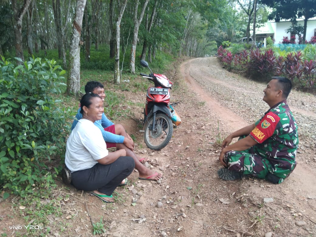 Komunikasi yang dilakukan oleh Babinsa pun tidak mengenal tempat, kali ini ia lakukan komunikasi dengan warga Binaannya di pinggiran jalan desa di area perkebunan karet.