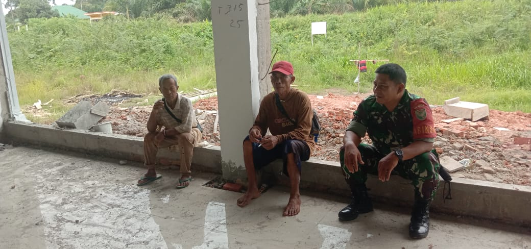 Himbau keselamatan kerja, Babinsa Koramil 406-03/Muara Rupit Serda Khairul Kusri Komsos dengan warga berprofesi sebagai tukang bangunan yang sedang istirahat, bertempat di Desa Lubuk Kumbung Kecamatan Karang Jaya Kabupaten Musi Rawas Utara,Selasa (21/02/2023).