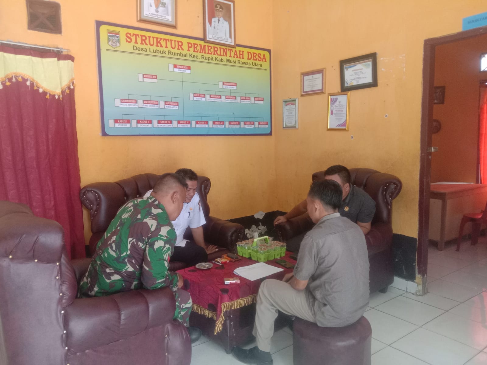 Koptu Desi Iskandar Babinsa Koramil 406-03/Muara Rupit melaksanakan Komsos di Kantor desa lubuk rumbai Bertempat Kantor Desa Lubuk Rumbai Kecamatan Rupit Kabupaten Musi Rawas Utara, Sabtu(01/04/2023).