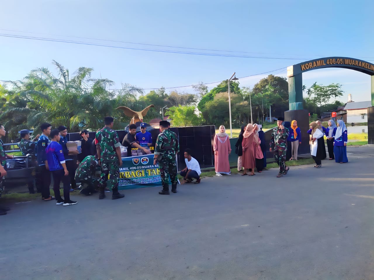 Pembagian takjil gratis dipimpin langsung oleh Danramil 406-05/Muara Kelingi Kapten Inf Ajun Taufik dan dilaksanakan saat menjelang berbuka puasa. Dalam pembagiannya melibatkan Prajurit, Ibu-ibu Persit dan Anggota Karang Taruna Muara Kelingi.