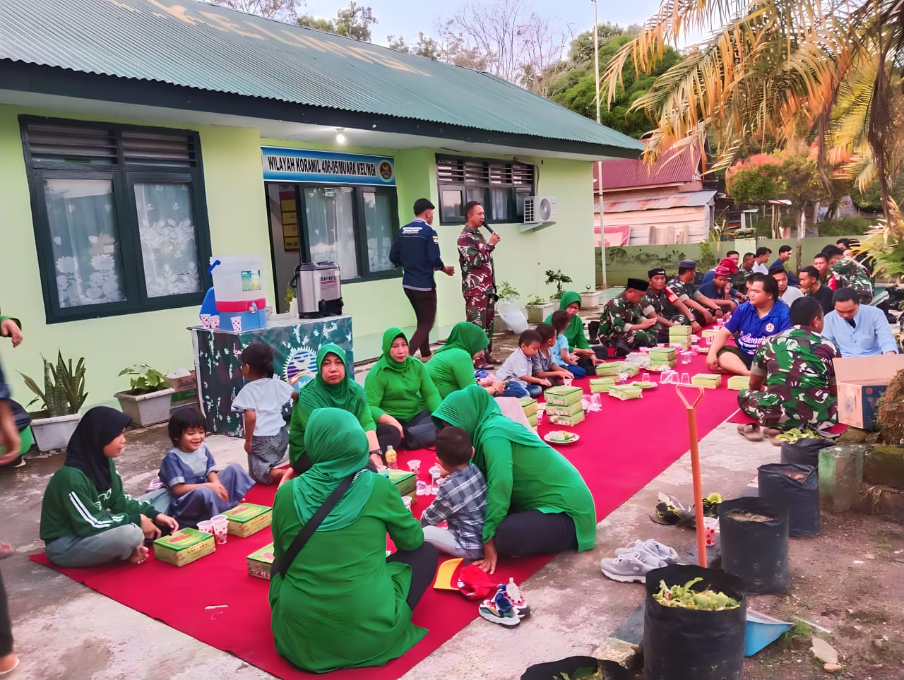 Seusai pelaksanaan pembagian Takjil Danramil beserta anggota, ibu-ibu Persit serta Anggota Karang Taruna melaksanakan Berbuka bersama didepan Makoramil 406-05/Muara Kelingi.(Pendim 0406/LLG).