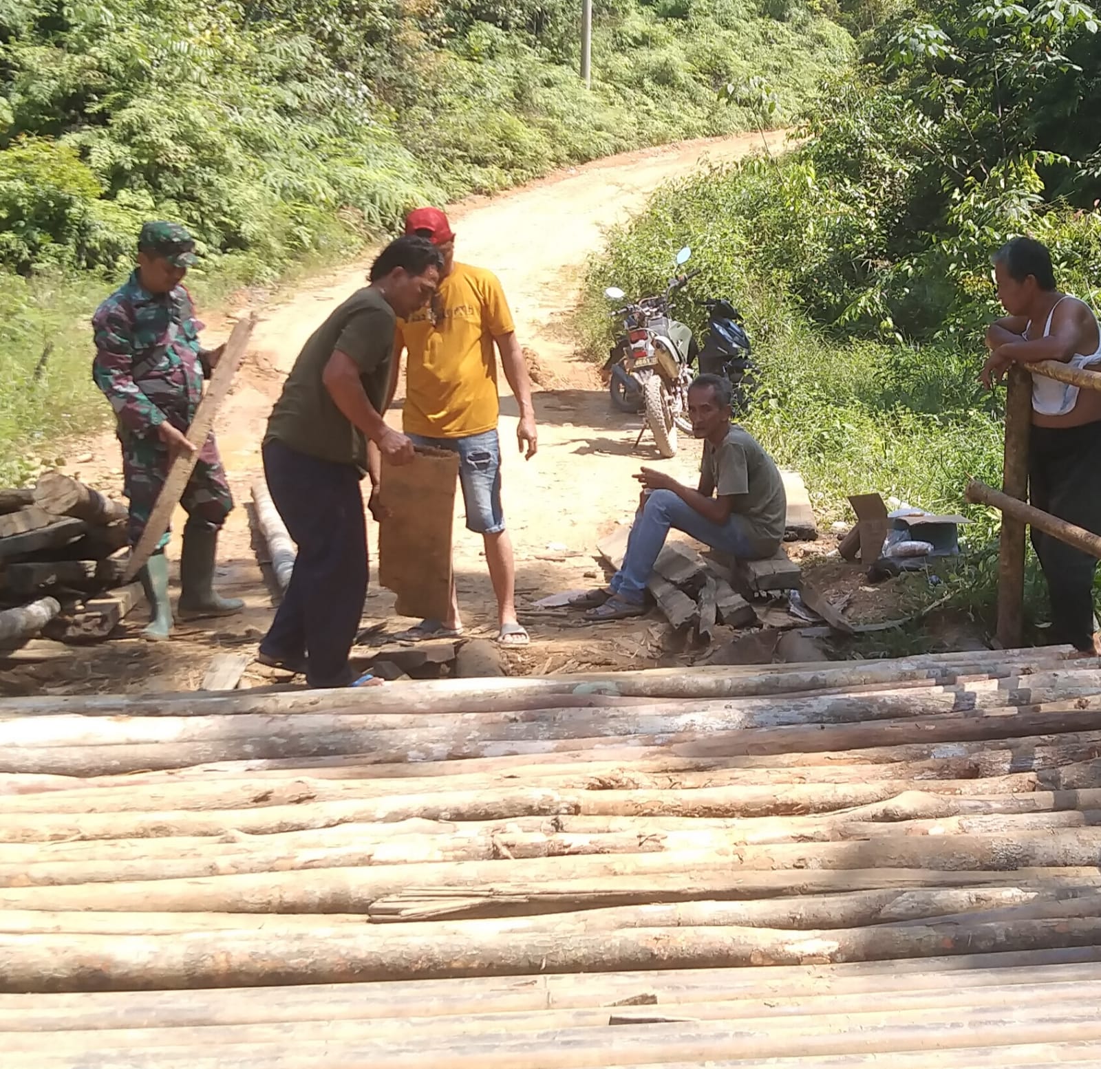 Babinsa air bening Koramil 406-02/Rawas Ilir bersama masyarakat melaksanakan gotong royong memperbaiki jembatan yang rusak. Kecamatan. Rawas Ilir Kabupaten Musi Rawas Utara, Minggu . (16/04/2023).