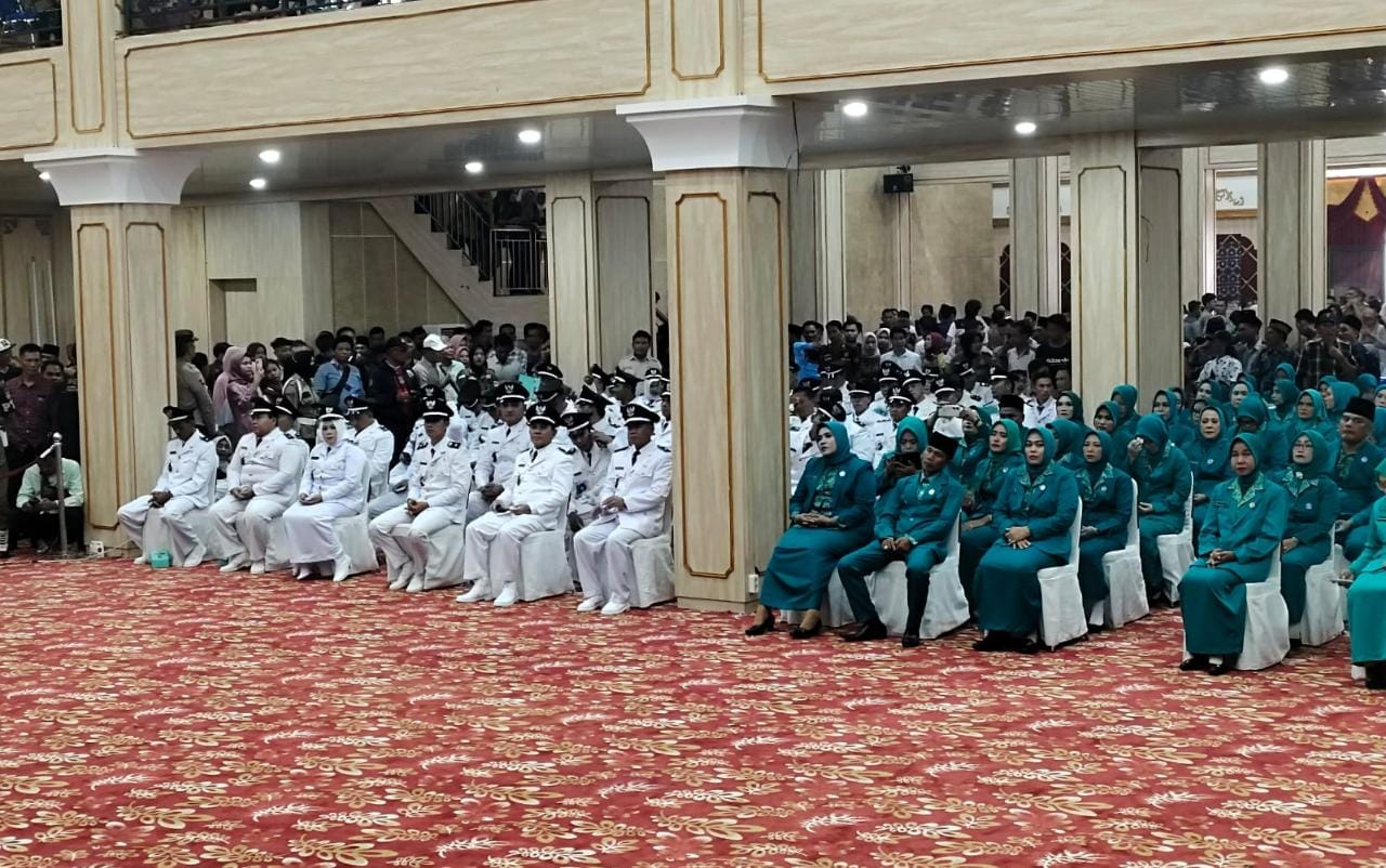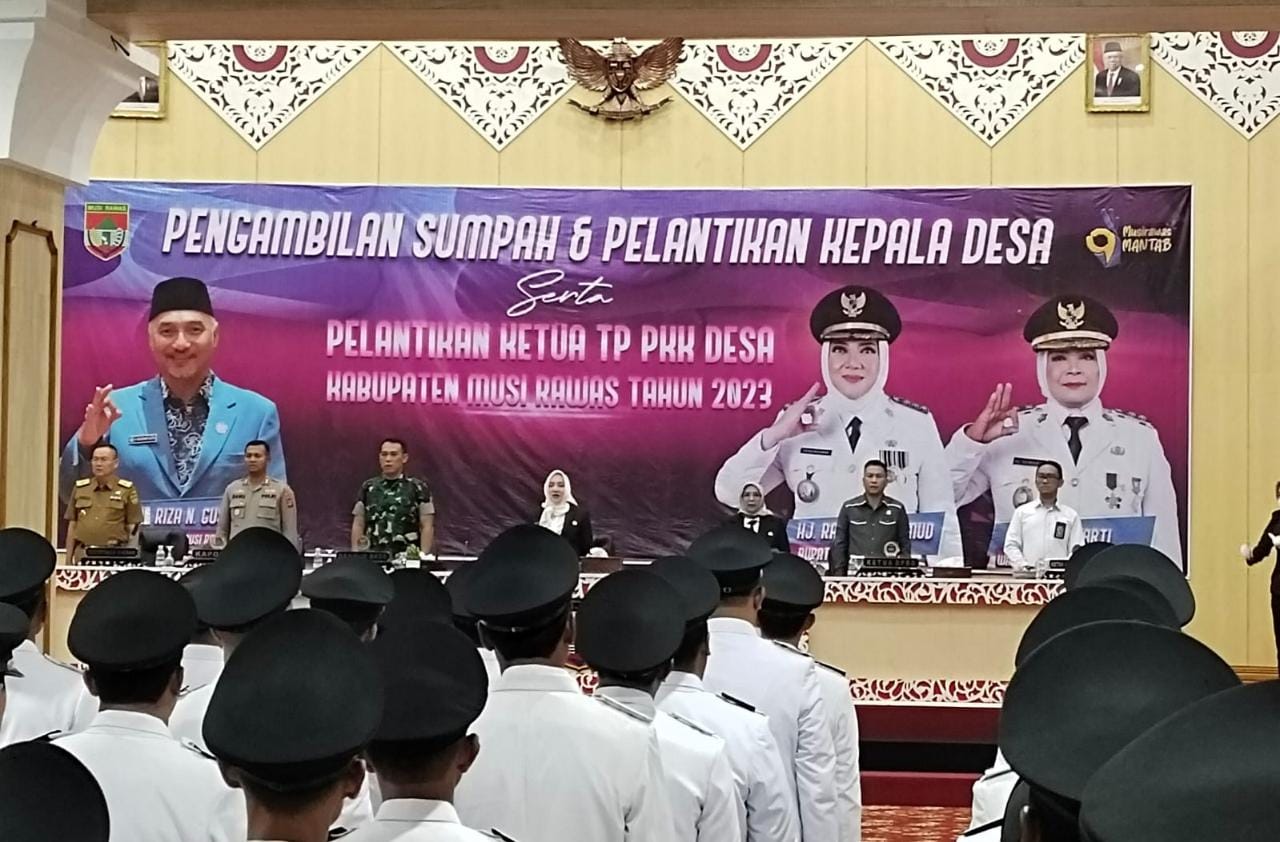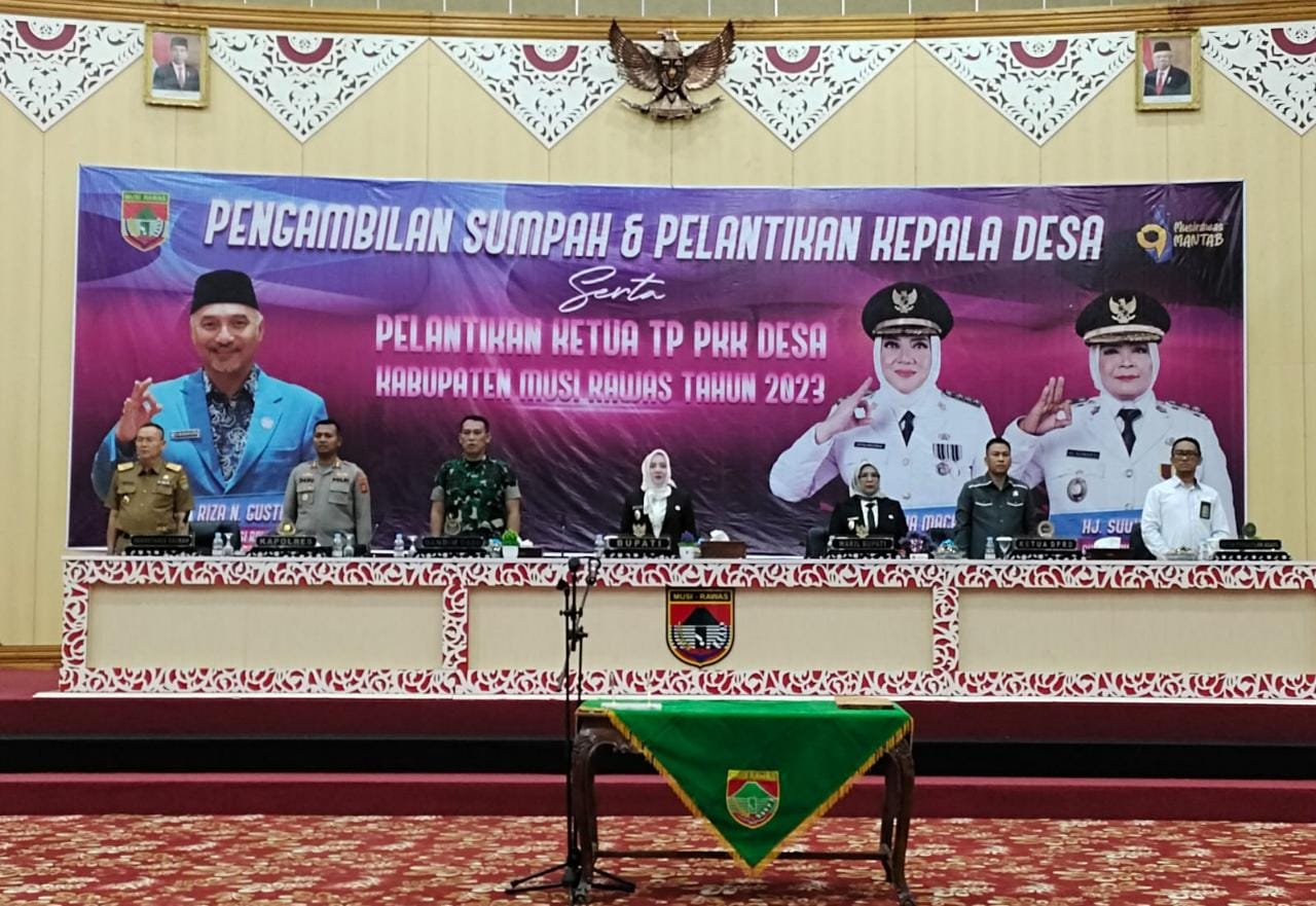 Acara pengambilan sumpah jabatan dan pelantikan kepala desa dan TP.PKK dihadiri Bupati Musi Rawas Hj. Ratna Machmud, Wakil Bupati Musi Rawas Hj. Suwarti, Dandim 0406/Lubuklinggau Letkol Arm Anggeng Prastyo Sulistiono S.E., M.Han, Kapolres Musirawas AKBP Danu Agus Purnomo S.I.K.,M.H.,Ketua DPRD Musi Rawas Bpk Azandri , Sekda Musirawas H. Aidil Rusman,dan undangan yang hadir. (Pendim 0406/LLG).
