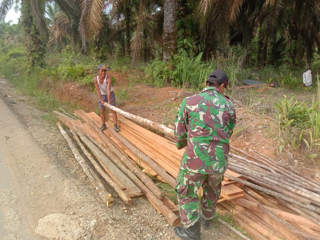 Lensa Garuda–Musi Rawas Utara. Babinsa Koramil 406-02/Rawas Ilir, Kodim 0406/Lubuklinggau Serda Ismail bersama warga gotong royong membangun pos ronda di Desa Mekarsari Kecamatan Rawas Ilir, Kabupaten Musi Rawas Utara. Minggu (21/05/2023).