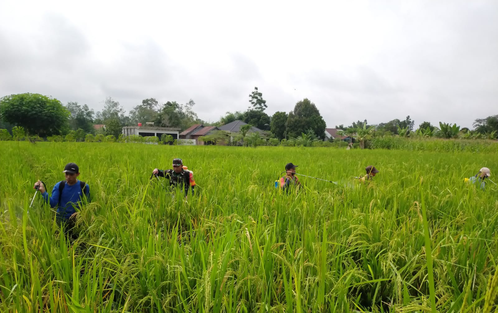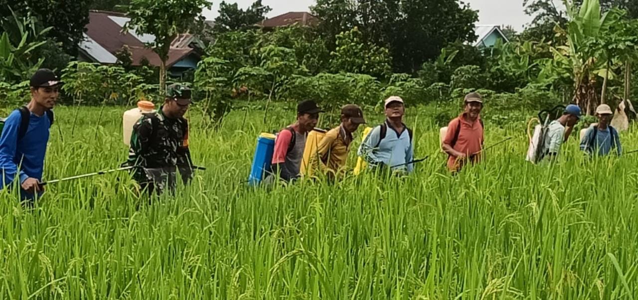 Babinsa Desa Mataram Dusun 1 Koramil 406-06/Tugumulyo Sertu Ma’rufi Kodim 0406/Lubuklinggau bersama kelompok tani dan Dinas Pertanian di Desa Mataram Dusun 1 Kecamatan Tugumulyo Kabupaten Musi Rawas menggelar pelaksanaan pengendalian hama wereng pada tanaman padi dalam rangka ketahanan pangan, Selasa ( 30/05/2023).