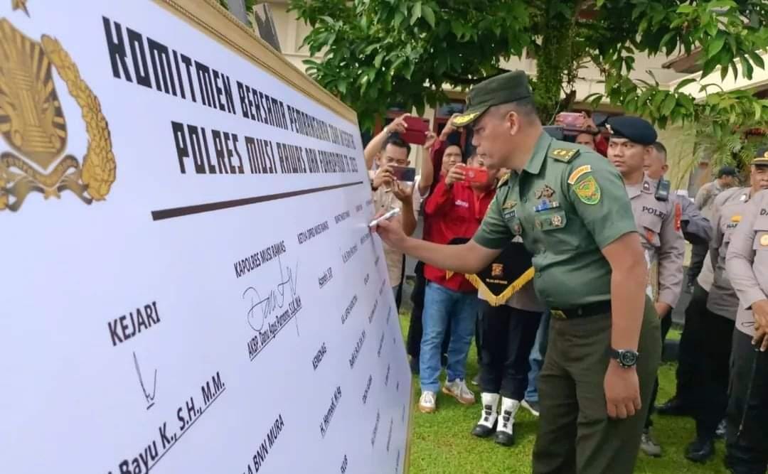 Di akhir upacara, Kapolres bersama unsur Forkopimda melakukan penandatanganan komitmen bersama pembangunan zona integritas di Wilayah Kabupaten Musi Rawas.(Pendim 0406/Lubuklinggau).