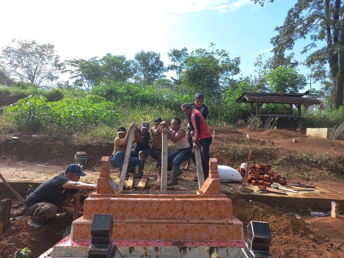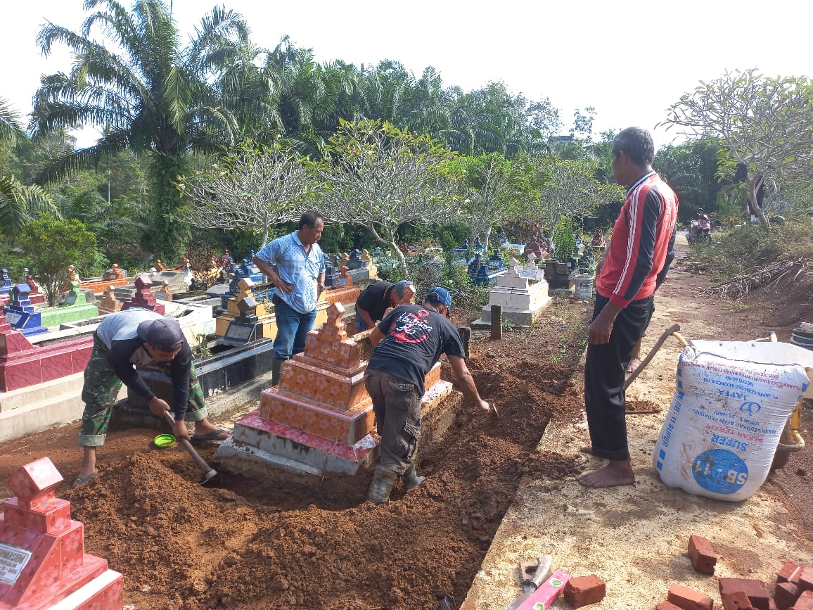 Babinsa Koramil 406-08/Kota Lubuklinghau Koptu Wahyu Budi Utomk gotong royong membantu masyarakat memperbaiki dan memasang batu nisan salah satu makam warga diwilayah binaannya di Kelurahan Margorejo kecamatan Lubuklinggau Utara 1 kota Lubuklinggau, Sabtu (10/06/2023).