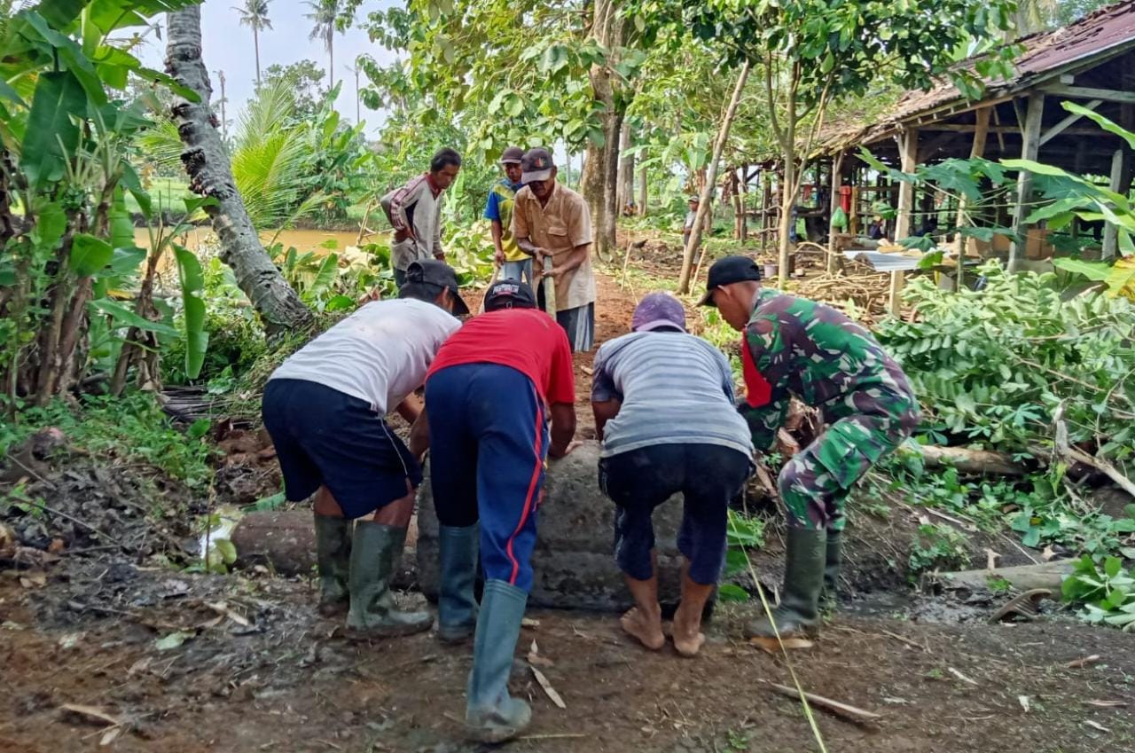 Babinsa Desa kali bening Sertu Mahyudi bersama warga binaan melaksanakan gotong royong membuat jalur alternatif di Desa kalibe ingin, Kecamatan Tugumulyo, Kabupaten Musi Rawas, Senin (12/06/2023).