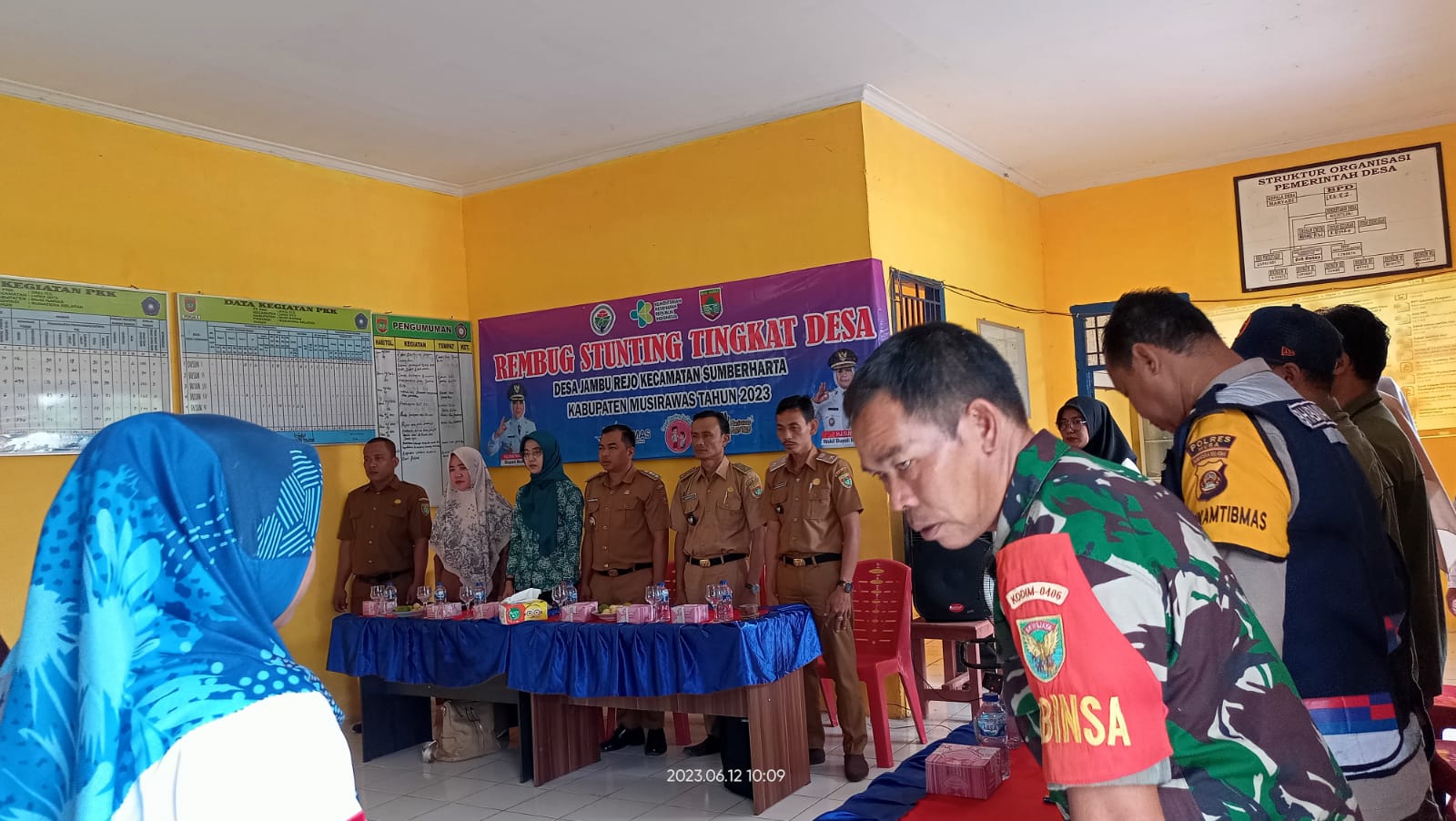Mendukung pemerintah dalam perbaikan pola hidup sehat dan gizi kesehatan Babinsa Koramil 09/Trawas, Kodim 0406/Lubuklinggau Sertu Susnadi Hadir pada acara kegiatan Rembuk Stunting yang berlangsung di Aula Desa jamburejo Kecamatan sumber harta Kabupaten Musi Rawas, Senin (12/06/2023).