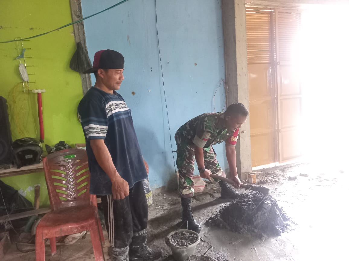 Dalam kegiatan ini, tampak Babinsa bekerjasama dengan semangat dan kompak dengan pemilik rumah dan juga warga sekitar, dalam melakukan pengolahan campuran semen yang dilanjutkan dengan pengecoran lantai bangunan yang nantinya akan digunakan sebagai dapur oleh warga binaannya tersebut.