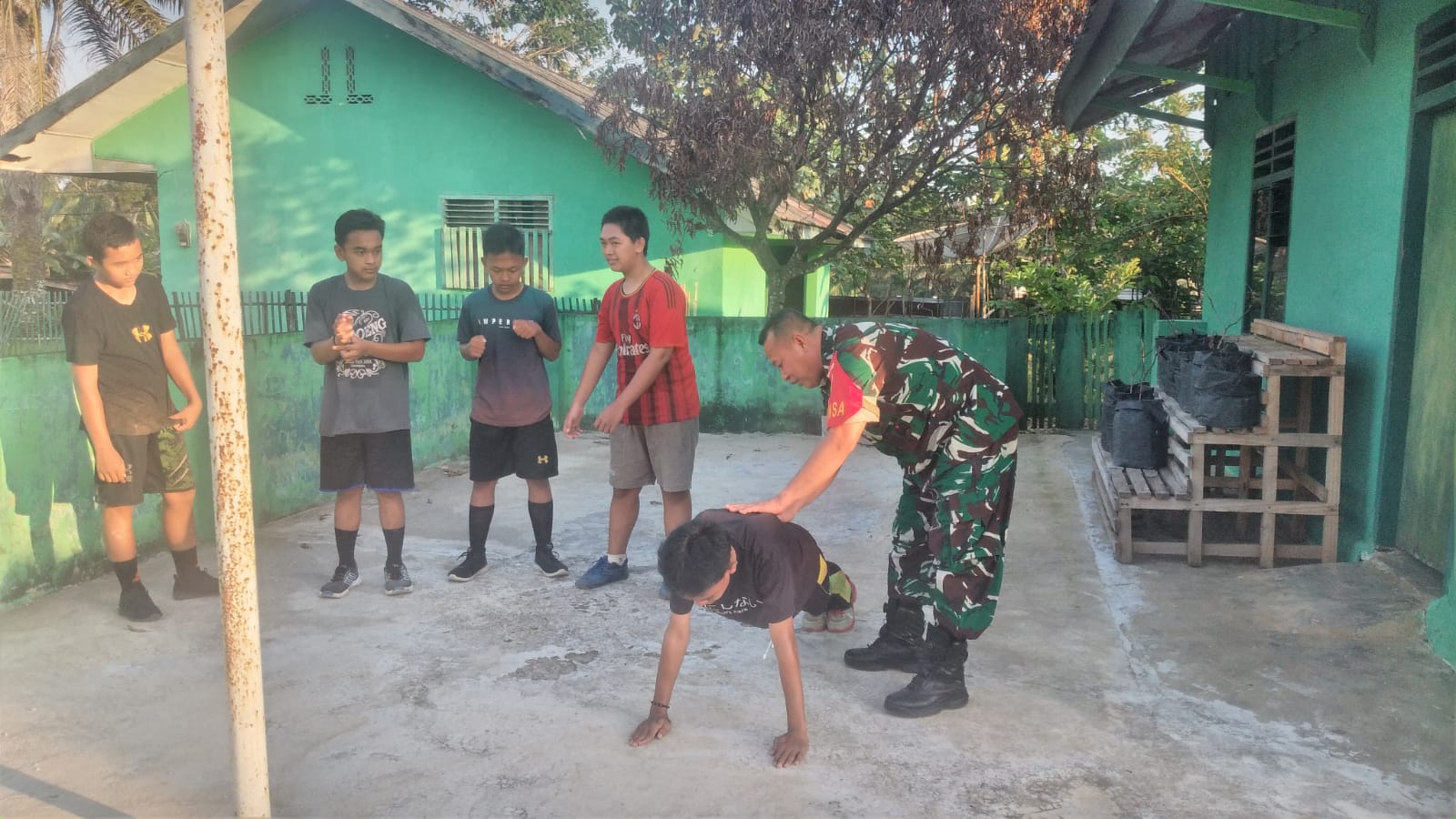 Sertu Rudi Hartono selaku instruktur, melakukan pelatihan kepada 6 orang remaja peserta Binjas, yang diawali dengan apel pengecekan di halaman Makoramil dan dilanjutkan pelatihan fisik di lapangan koramil.