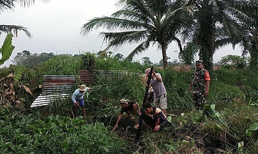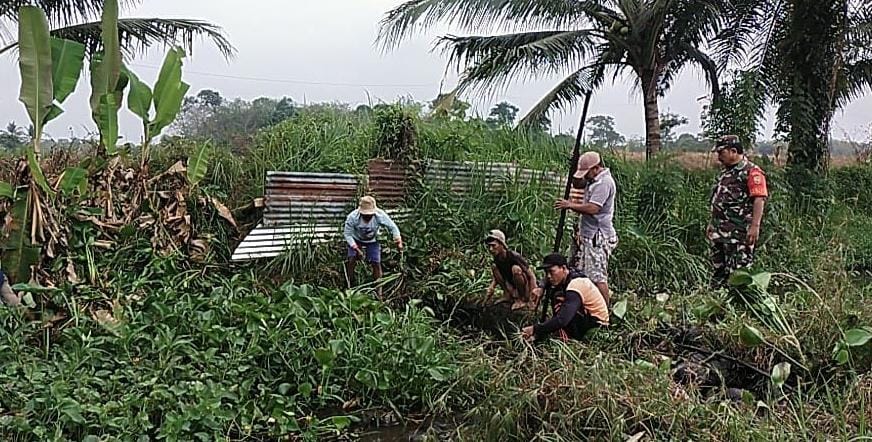 Babinsa Koramil 406-06/Tugumulyo Kopka Mujiono Melaksanakan Kegiatan Gotong Royong Membersihkan Saluran irigrasi di desa satan indah jaya Kecamatan Tugumulyo Kabupaten Musi Rawas Minggu (30/07/2023).