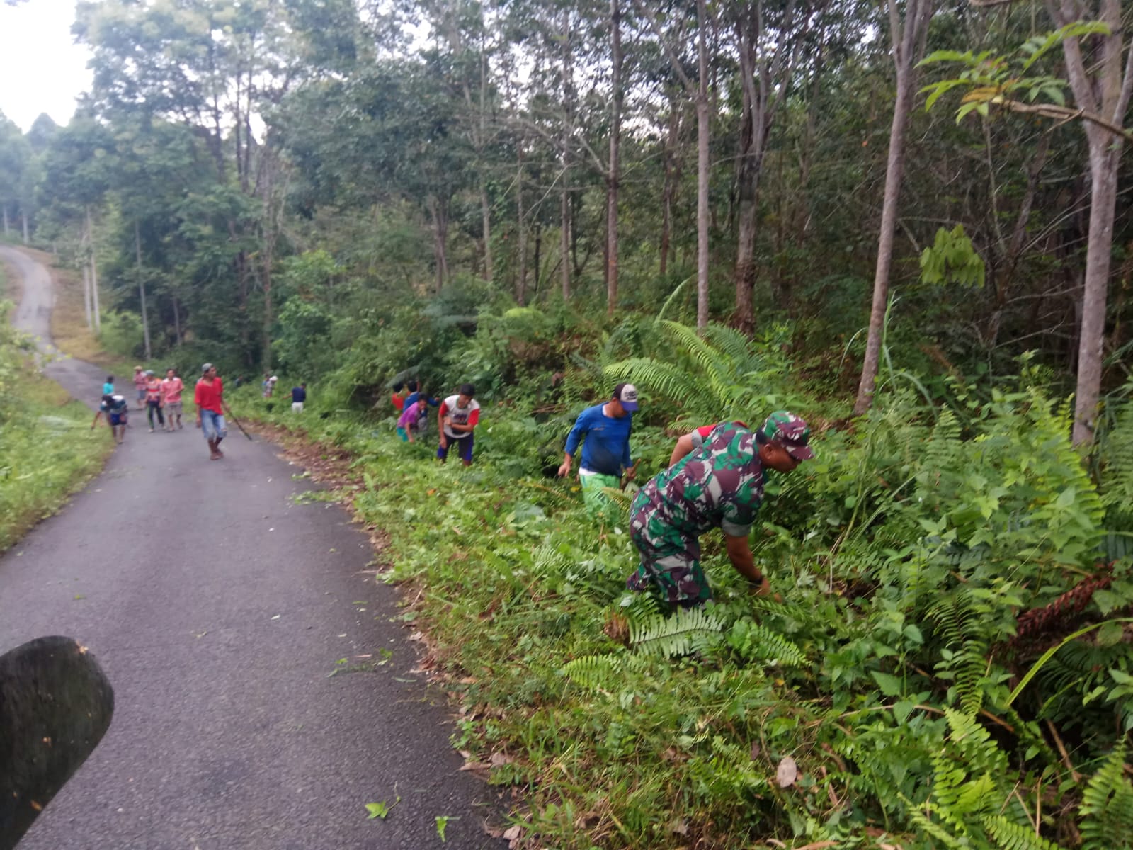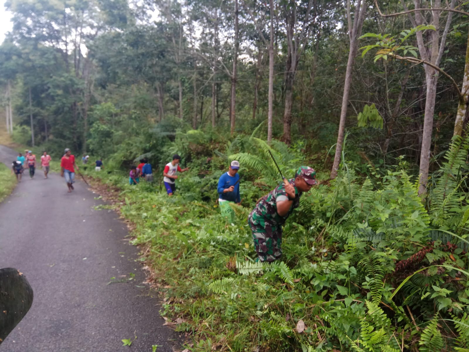 Babinsa Koramil 406-09/Terawas Kopka Yudo Kusumo Melaksanakan Kegiatan Gotong Royong Tebas bayang di desa perabu menang, kecamatan selangit Kabupaten Musi Rawas Minggu (30/07/2023).