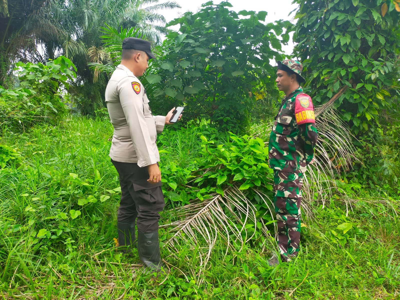 Babinsa dan babinkamtibmas serta mitra karib Babinsa Cegah Karhutla Melalui Patroli di perkebunan sawit masyarakat desa binaan.