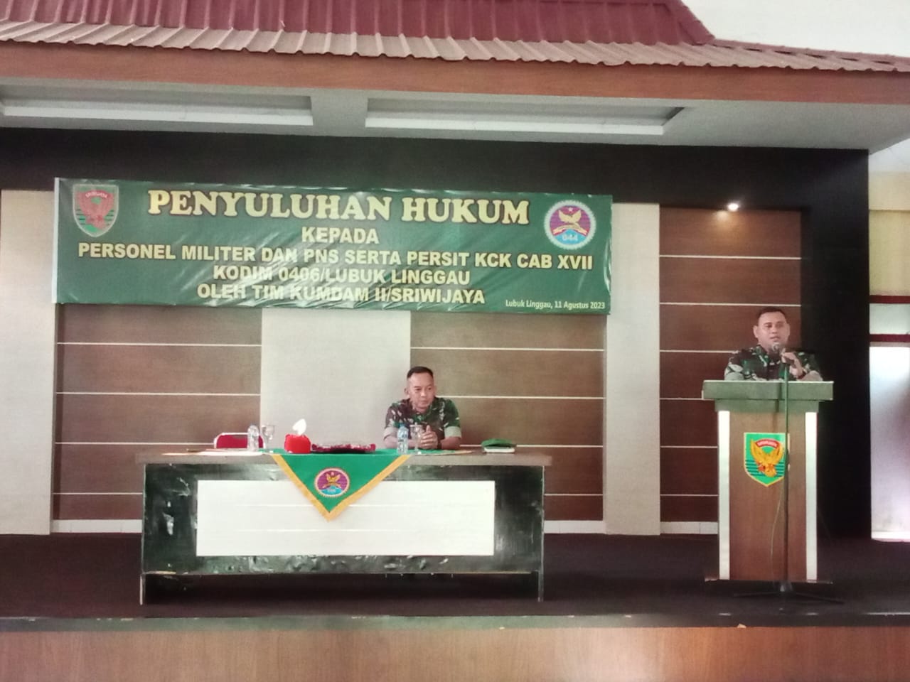 Lensa Garuda- Lubuk Linggau, Dalam rangka meningkatkan kesadaran hukum dan meminimalisir angka pelanggaran disiplin prajurit dan PNS Kodim 0406/Lubuk Linggau. Personel TNI dan PNS serta Persit Kartika Chandra Kirana Cabang XVII Kodim 0406/Lubuk Linggau menerima penyuluhan hukum dari Tim Kumdam II/Sriwijaya. Bertempat di Aula Pamungkas Kodim 0406/Lubuk Linggau Jl. Garuda Kelurahan Tanjung Indah, Kecamatan Lubuk Linggau Barat I, Kota Lubuk Linggau. Jum’at (11/08/2023).