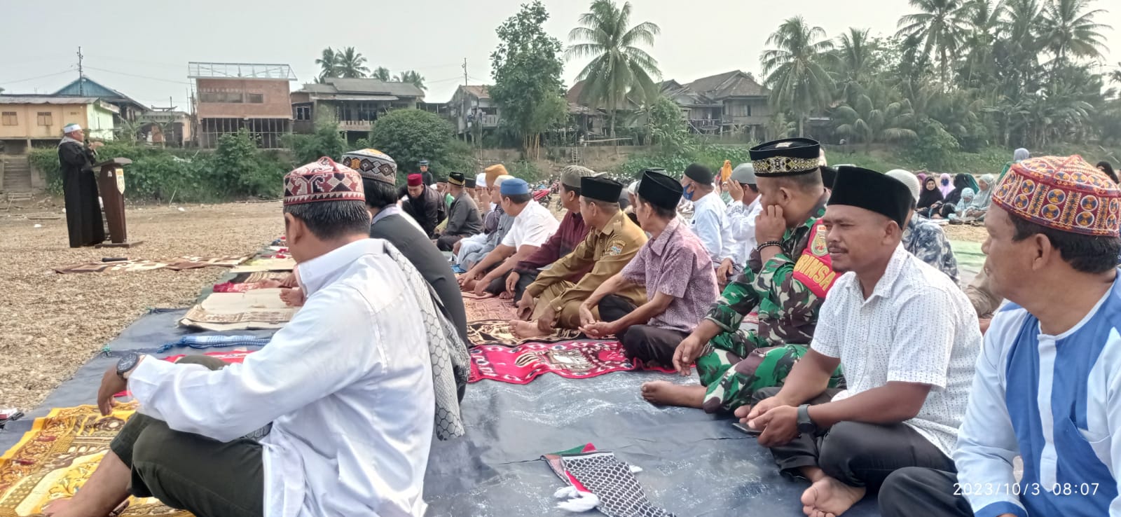 Komandan Koramil 406-03/Muara Rupit Kapten Inf M.Assad Di Wakilkan Danpos Koramil 406-03/Muara Rupit Sertu Baswandi dan Babinsa bersama unsur Forkopimcam dan masyarakat mengikuti kegiatan Sholat Istisqo (Minta hujan), Istighosah dan Do’a Bersama bertempat di Lapangan Pulau Ilir Sungai Rupit Pulau Tengah Jembatan Rupit Kelurahan Rupit Desa Lawang Agung Kecamatan Rupit Kabupaten Musi Rawas Utara, Selasa (03/10/2023).