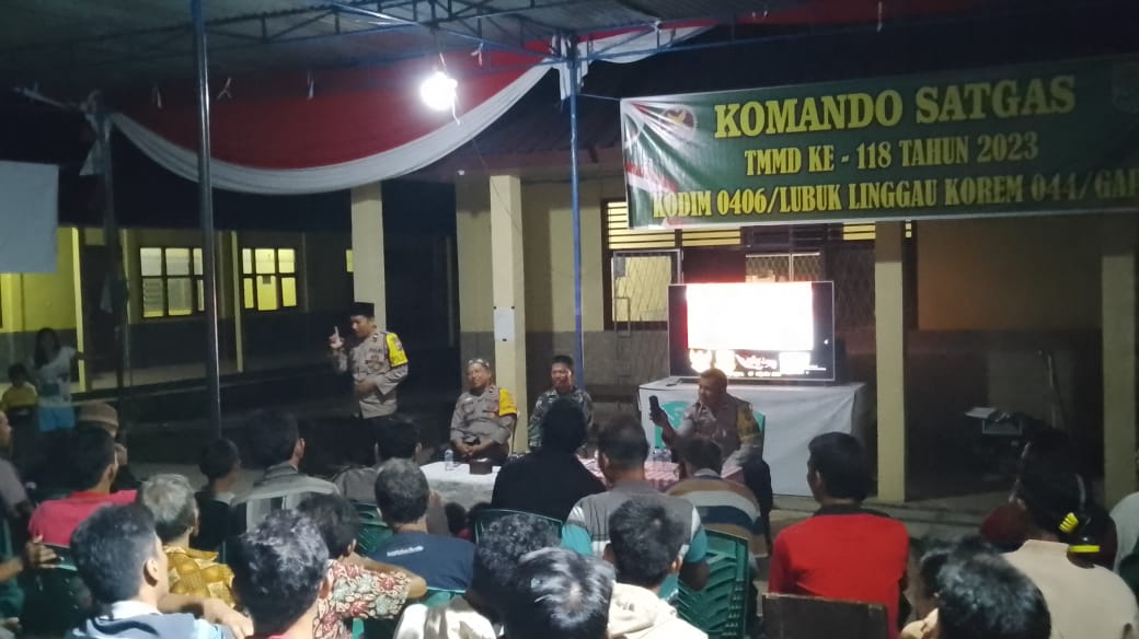 Pada kegiatan penyuluhan Hukum dilaksanakan di Posko TMMD pada malam hari ini satgas TMMD Reguler Ke 118 Kodim 0406/Lubuk Linggau mendatangkan narasumber dari Personil Polres Lubuk Linggau yaitu Aipda Rizal Kanit Binmas Polsek Lubuk Linggau Timur dengan di dampingi oleh Bhabinkamtibmas.