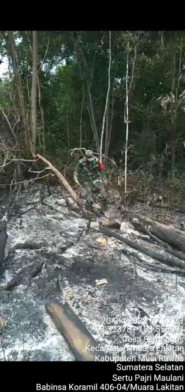 Babinsa Koramil 406-04/Muara Lakitan Sertu Fajri maulani yang tergabung pada Tim Satuan Tugas kebakaran hutan dan lahan,bersama warga turun ke lapangan guna Pastika api padam di wilayah desa Semangus baru Kecamatan muara lakitan, Kabupaten Musi Rawas. Jum’at (20/10/2023).
