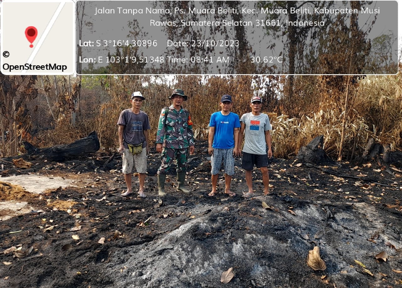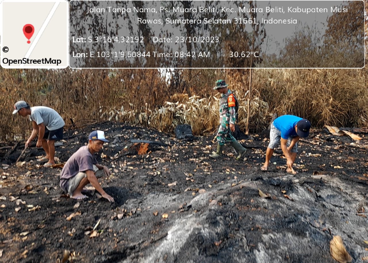 Babinsa Koramil 406-06/Tugumulyo Koptu Taufiq Bersama Warga Melaksanakan Pengecekan/ Mamasikan  Padam Api  Di desa Muara Beliti Baru  , Kecamatan Muara Beliti , Kabupaten Musi Rawas