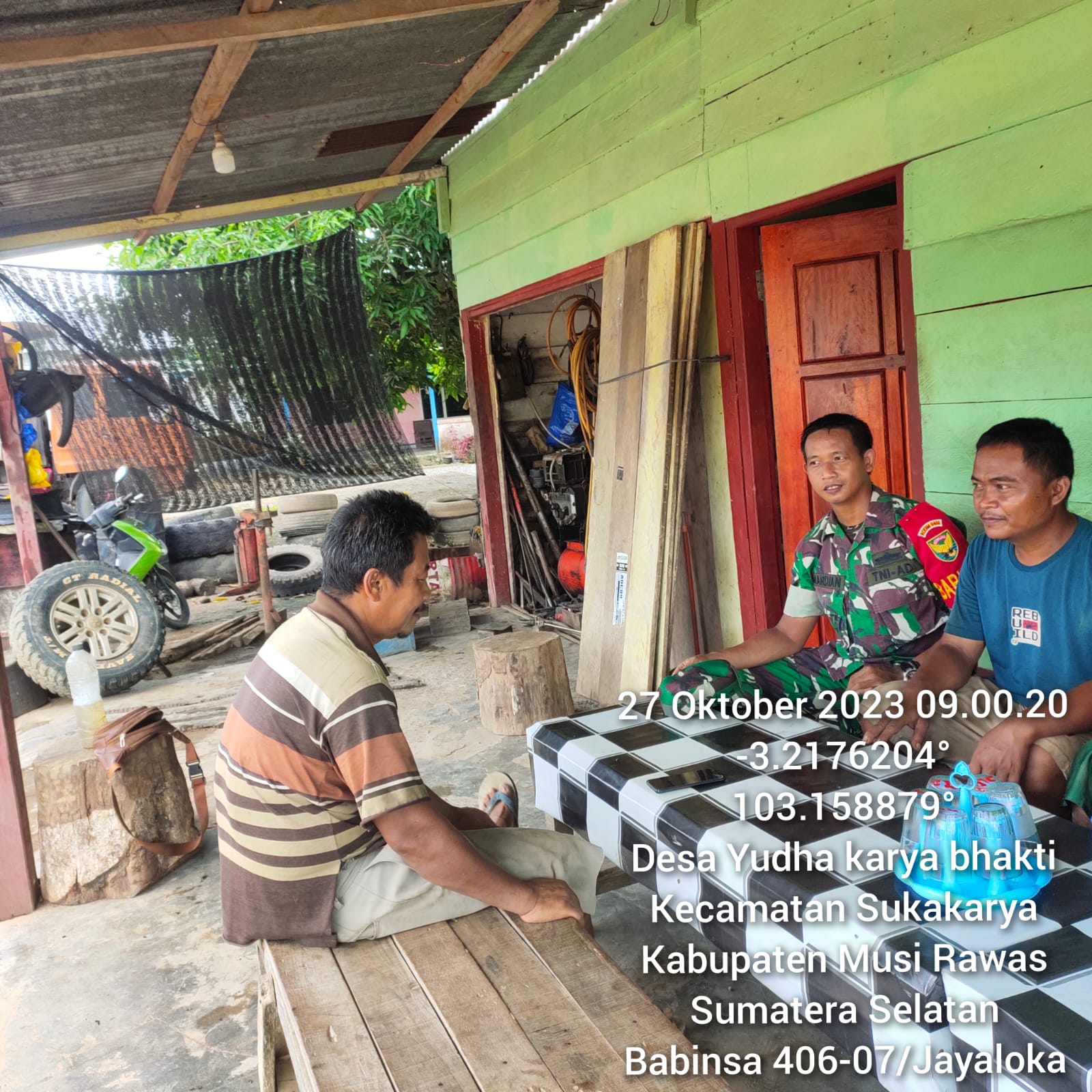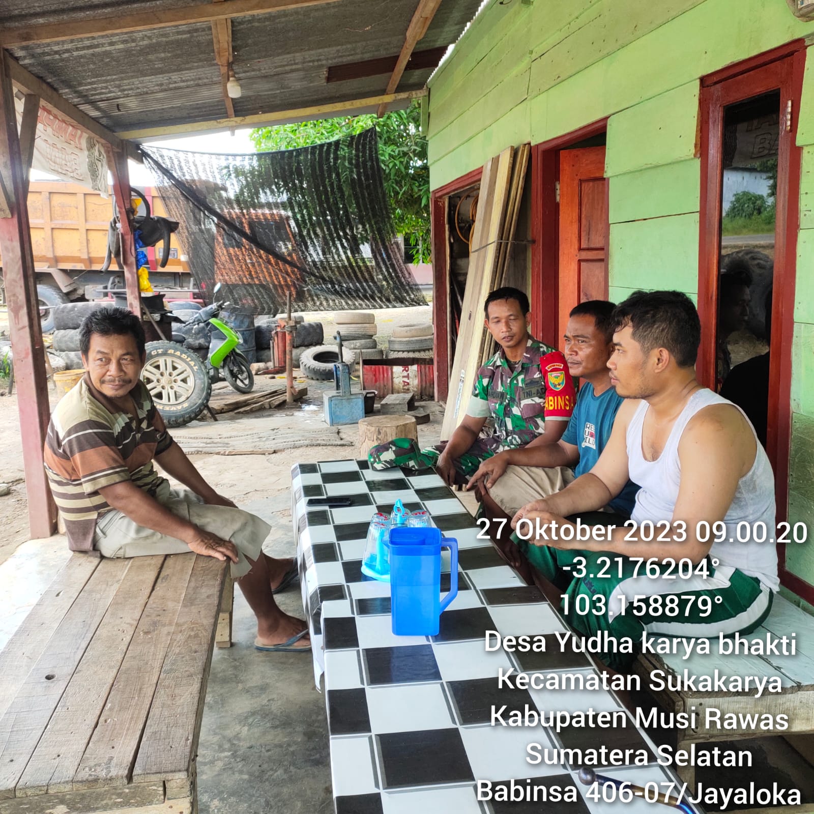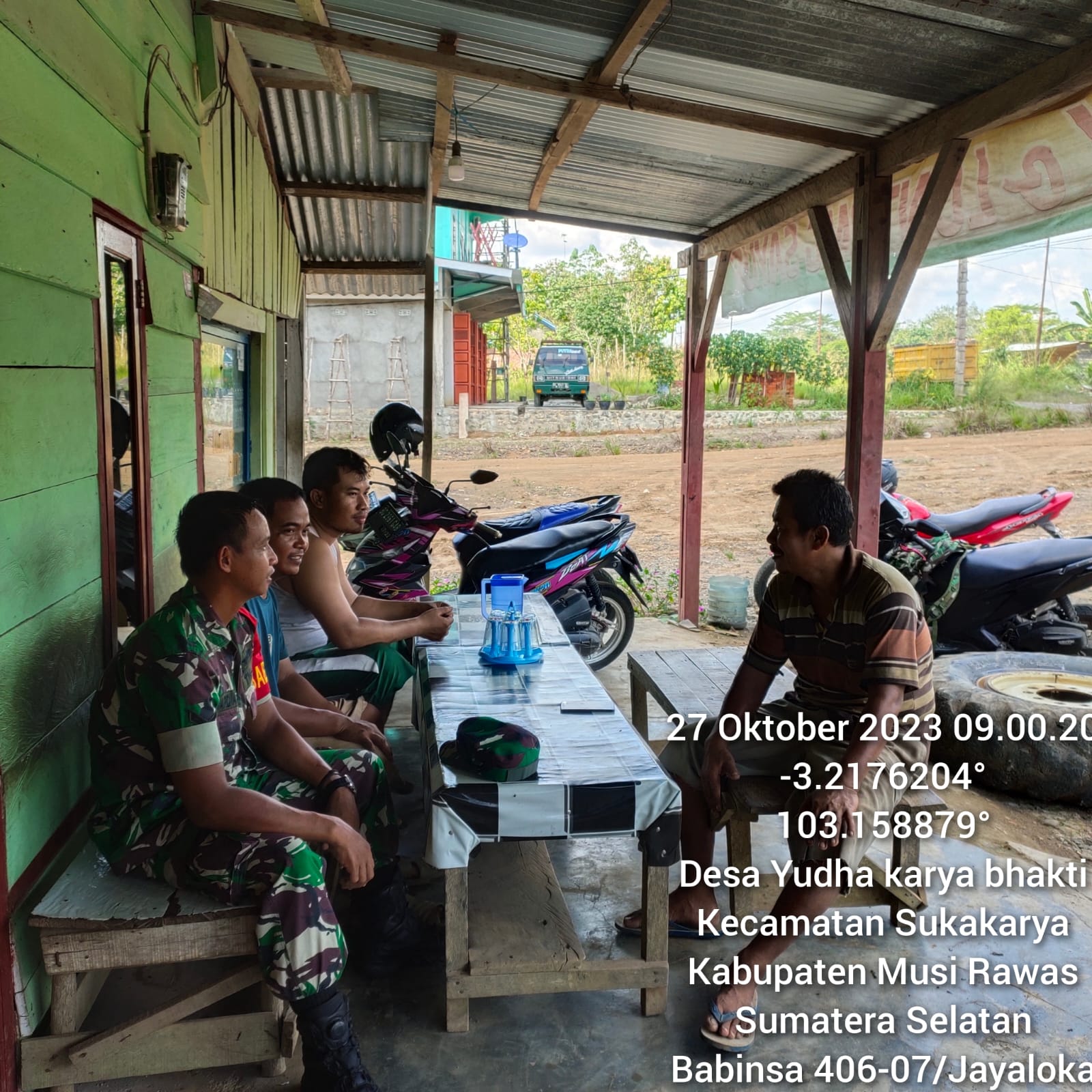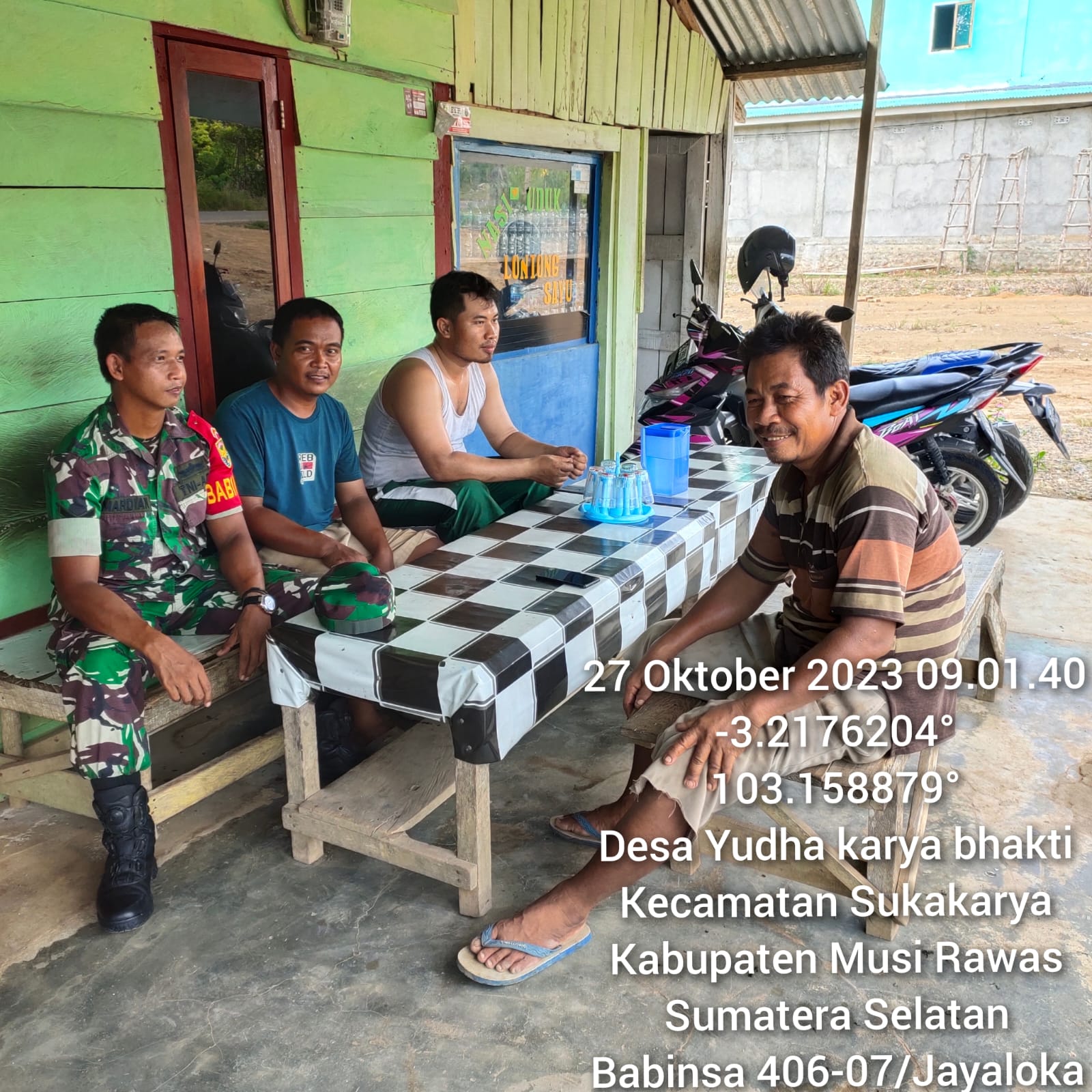 kegiatan komunikasi sosial (Kosmos) selain silaturahmi untuk mempererat hubungan TNI dan rakyat juga untuk mengetahui perkembangan situasi di wilayah binaan.Hal tersebut ditegaskan Babinsa desa Yuda karya Bekti Koramil 0406-07/jayaloka Serda Mardian melaksanakan Komsos dengan warga binaannya, di desa Yuda karya kecamatan jayaloka kabupaten Musi Rawas. Jum’at (27/10/2023).