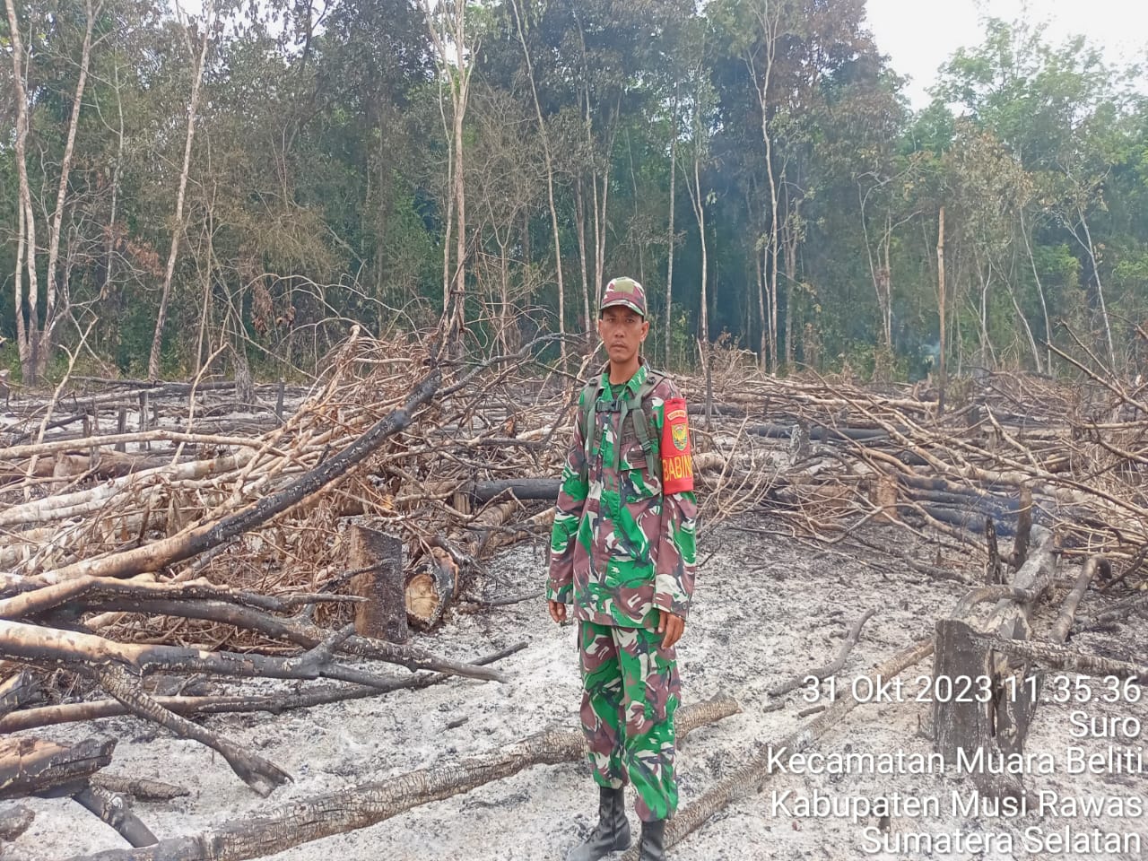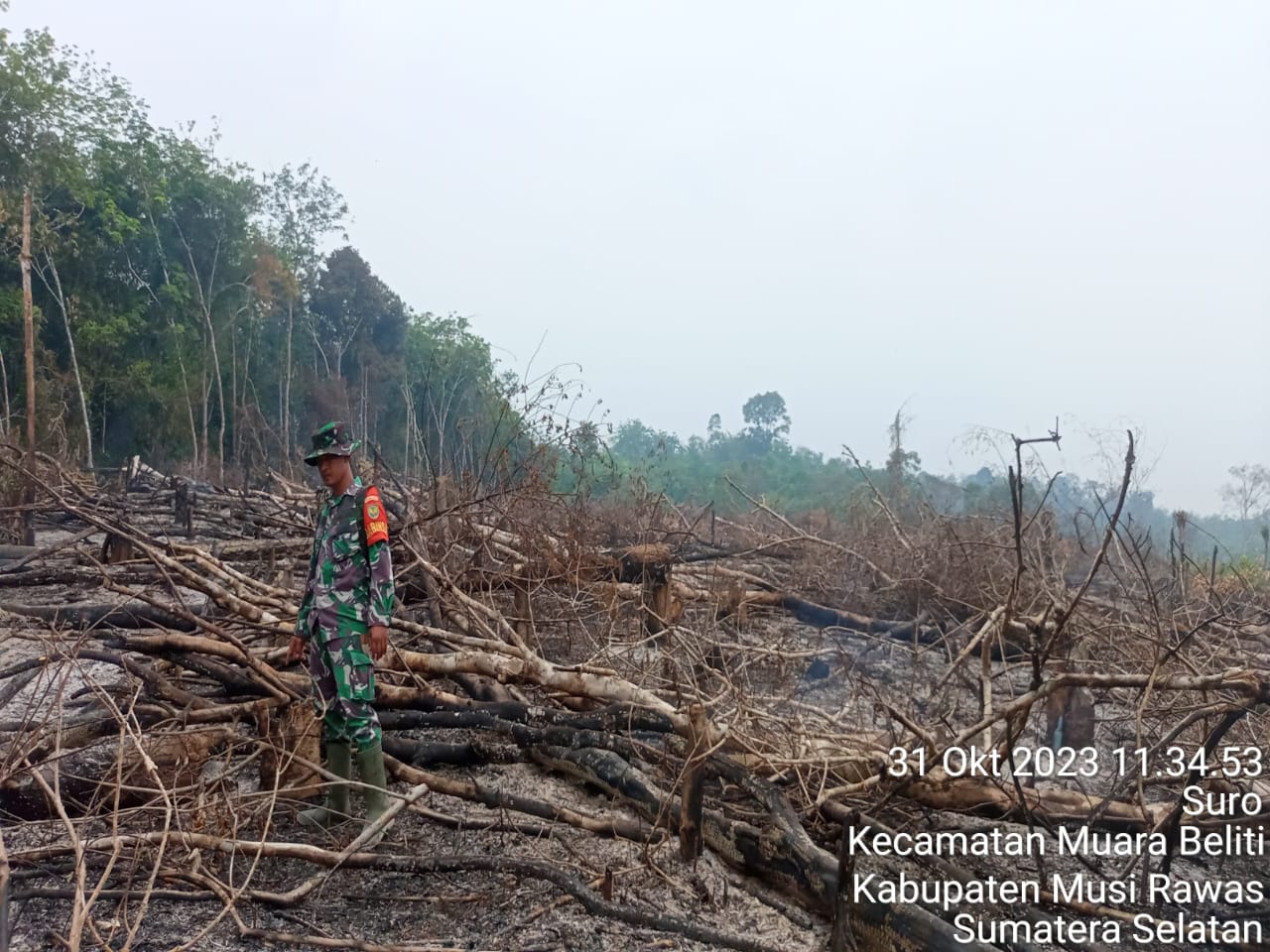 Babinsa Tugumulyo Serda Sudarto Meninjau Langsung Kondisi Lahan Yang sudah terbakar dan Mengantisipasi Bahaya Titiik api Di lahan Tersebut.