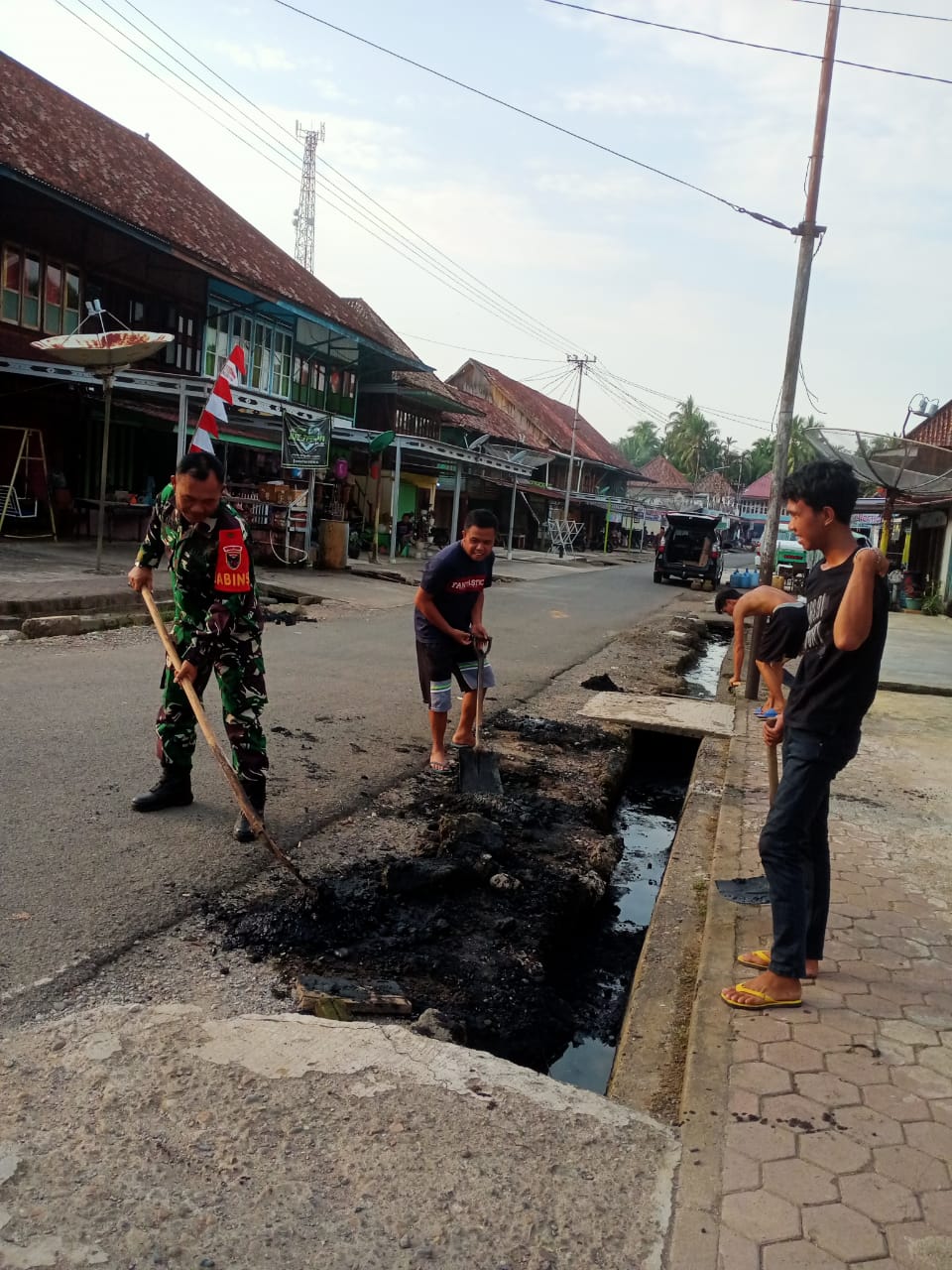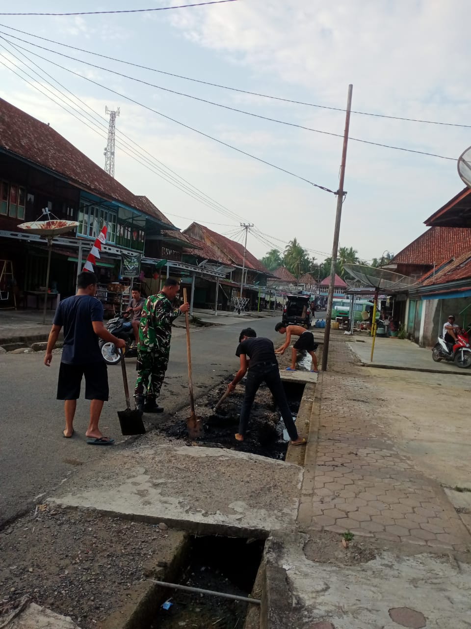 Babinsa Koramil 406-04/Muara Lakitan Sertu Sutarno melaksanakan Karya Bakti bersama masyarakat di wilayah binaan membersihkan selokan di kelurahan Muara Lakitan.