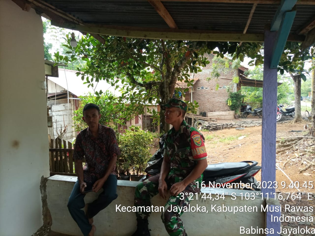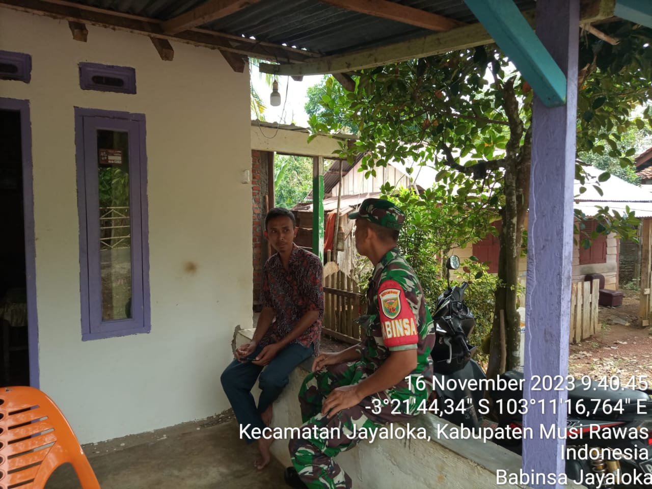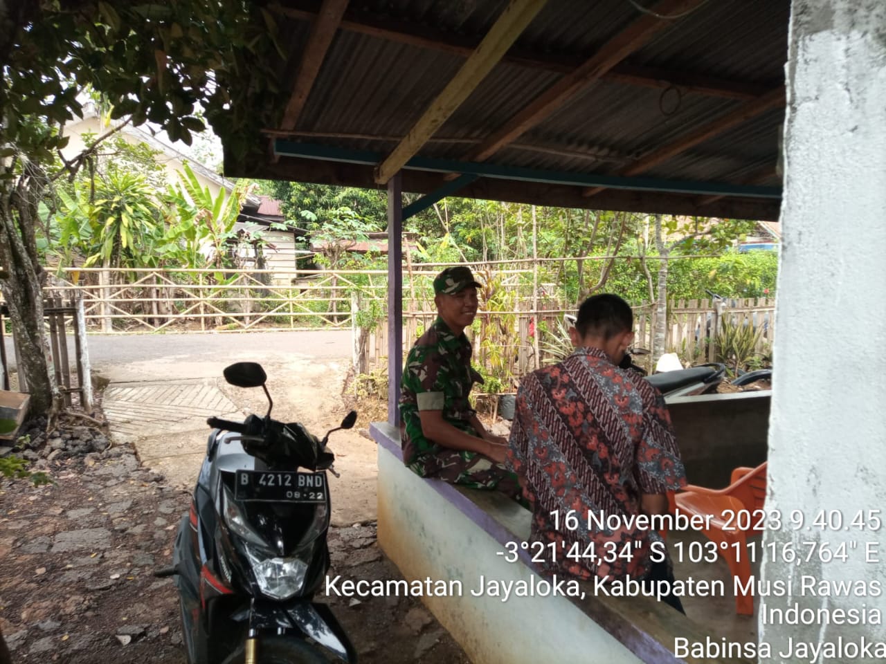 Babinsa Koramil 406-07/jayaloka Kodim 0406/Lubuklinggau Serda Yuda Ade Hermawan sambangi rumah warga binaan untuk melaksanakan Komunikasi Sosial (Komsos) dengan bersilaturahmi bersama warga desa binaan bertempat di rumah warga Desa Purwodadi,Kecamatan jayaloka , Kabupaten Musi Rawas. Kamis (16-11-2023).