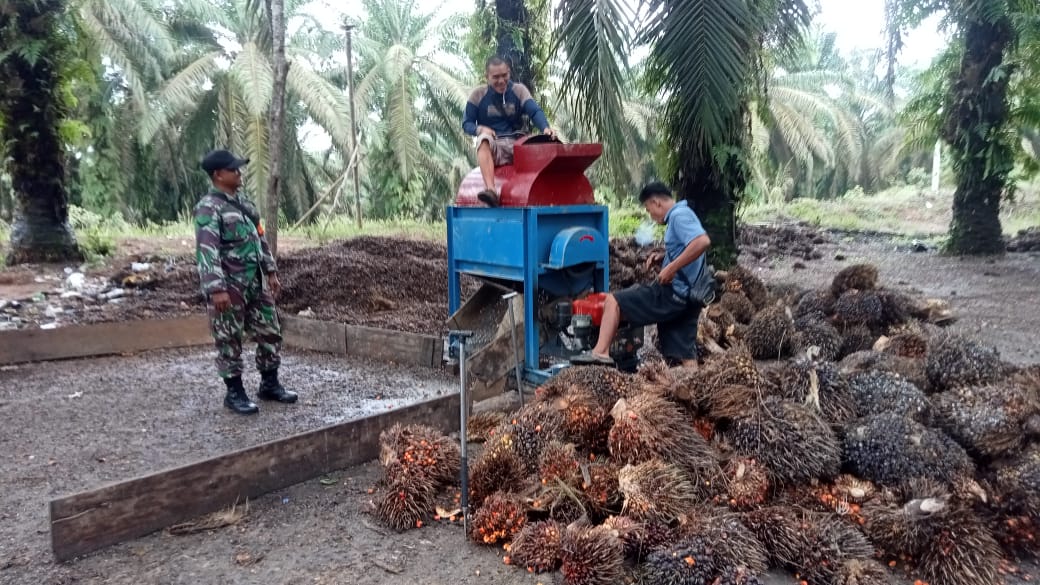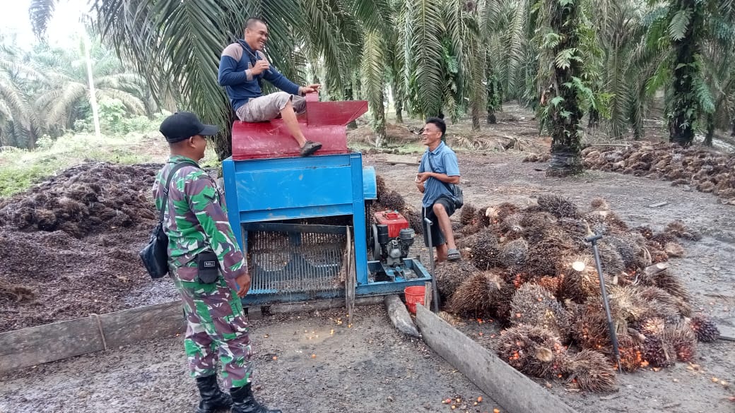 Babinsa Koramil 406-02/Rawas ulu Serda Robi firdaus komsos dengan petani sawit ingatkan tentang keselamatan kerja.