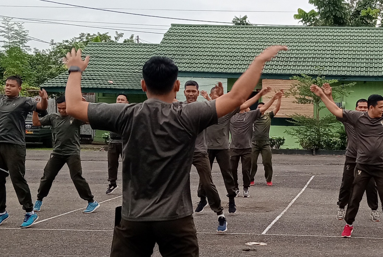 Di selah”kegiatan rutin sehari”personel staf kodim 0406/Lubuklinggau selalu menjaga kebugaran tubuh seperti yang di lakukan pada pagi hari ini,anggota staf kodim melakukan apel pagi dan di lanjutkan senam pemanasan sebelum melaku kan jalan santai di seputaran asrama kodim.