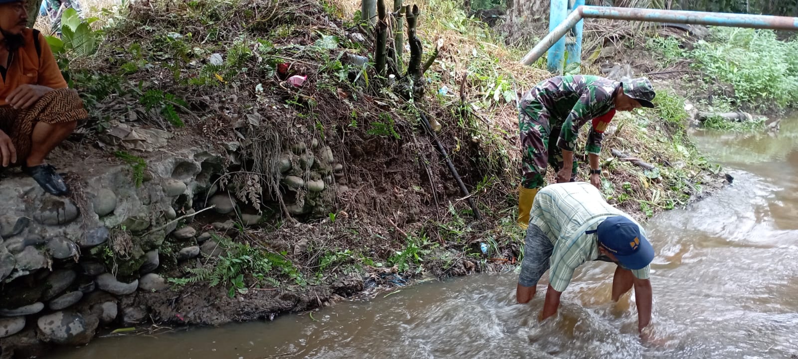 Sertu MB Simanjuntak bersama warga bersihkan aliran parit di wilayah binaan.