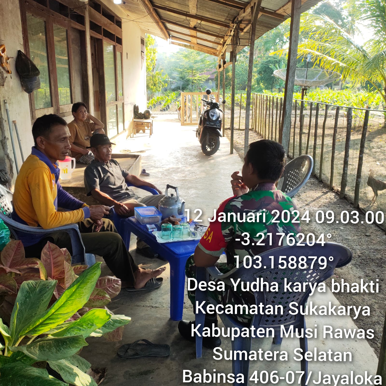 Guna menjalin kemanunggalan TNI dengan Rakyat, Babinsa Koramil 406-07/jayaloka Kodim 0406/Lubuklinggau Serda Mardiyan dan Bhabinkamtibmas Melaksanakan Komsos bersama masyarakat desa di Yuda karya Kecamatan Sukakarya Kabupaten Musi Rawas. Jum’at (12/01/2024).