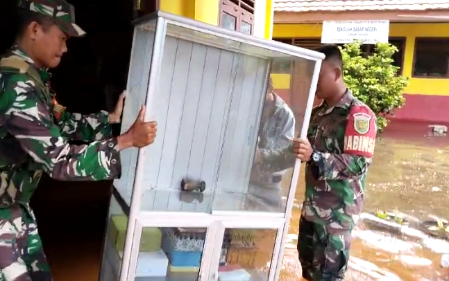 Babinsa Koramil 406-05/ Muara Kelingi Bantu Pihak Sekolah Menyelamatkan Buku dan Peralatan Sekolah