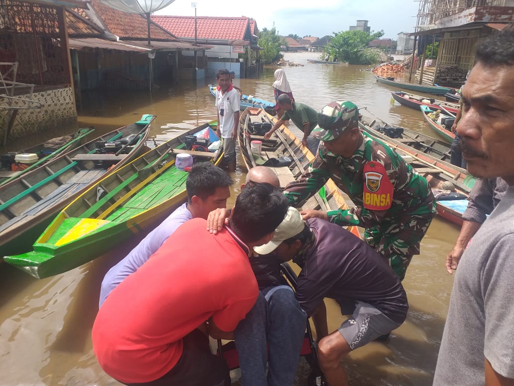 Babinsa Koramil 406-02/Rawas ilir serma endang membantu warga menyebrangi sungai dikelurahan Bingin teluk Kecamatan Rawas ilir Musi Rawas Utara.rabu(17/01/2024).