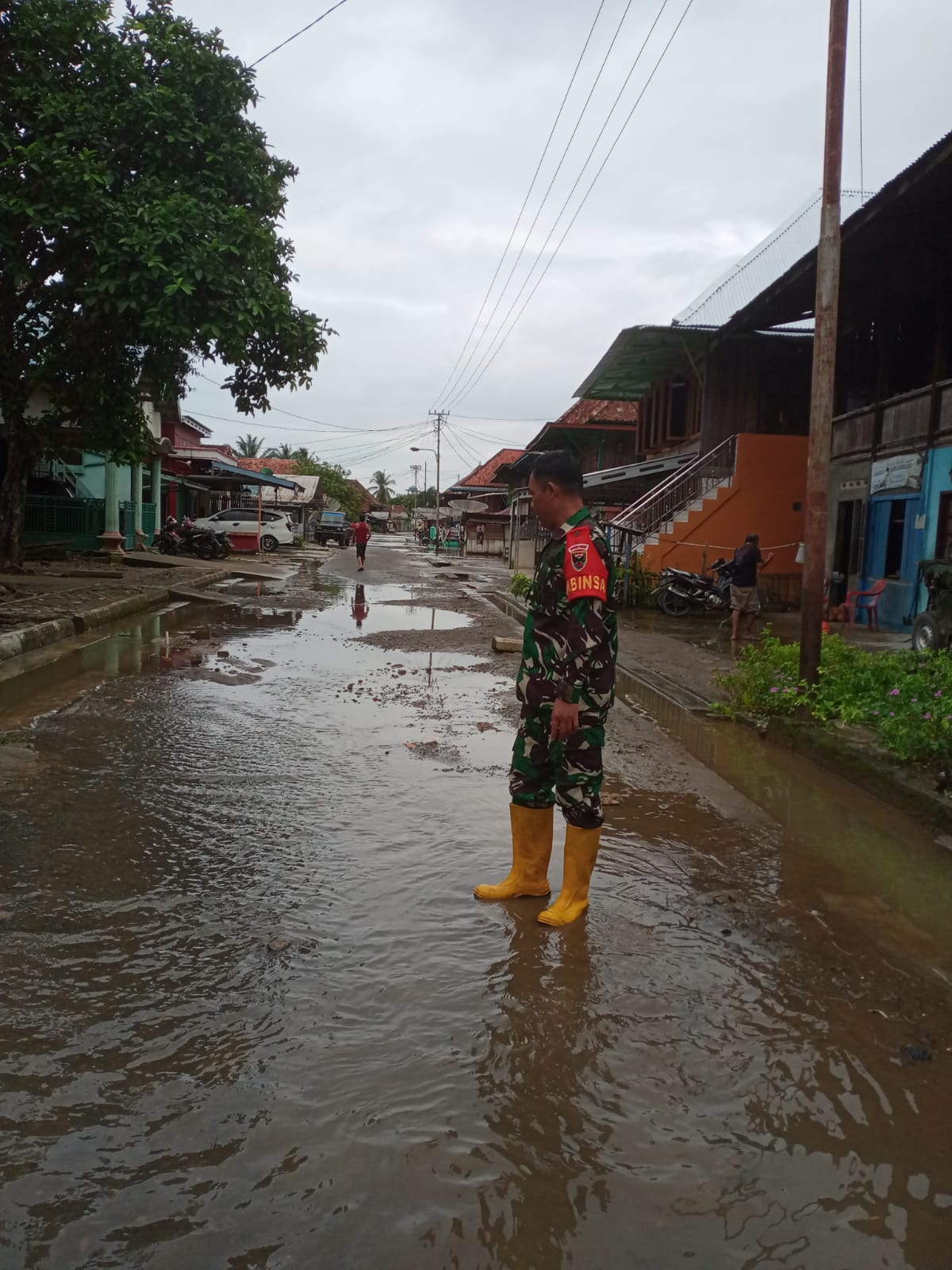 Sertu Sutarno Babinsa Koramil 406-04/Muara Lakitan pantau wilayah yeng terdapat banjir