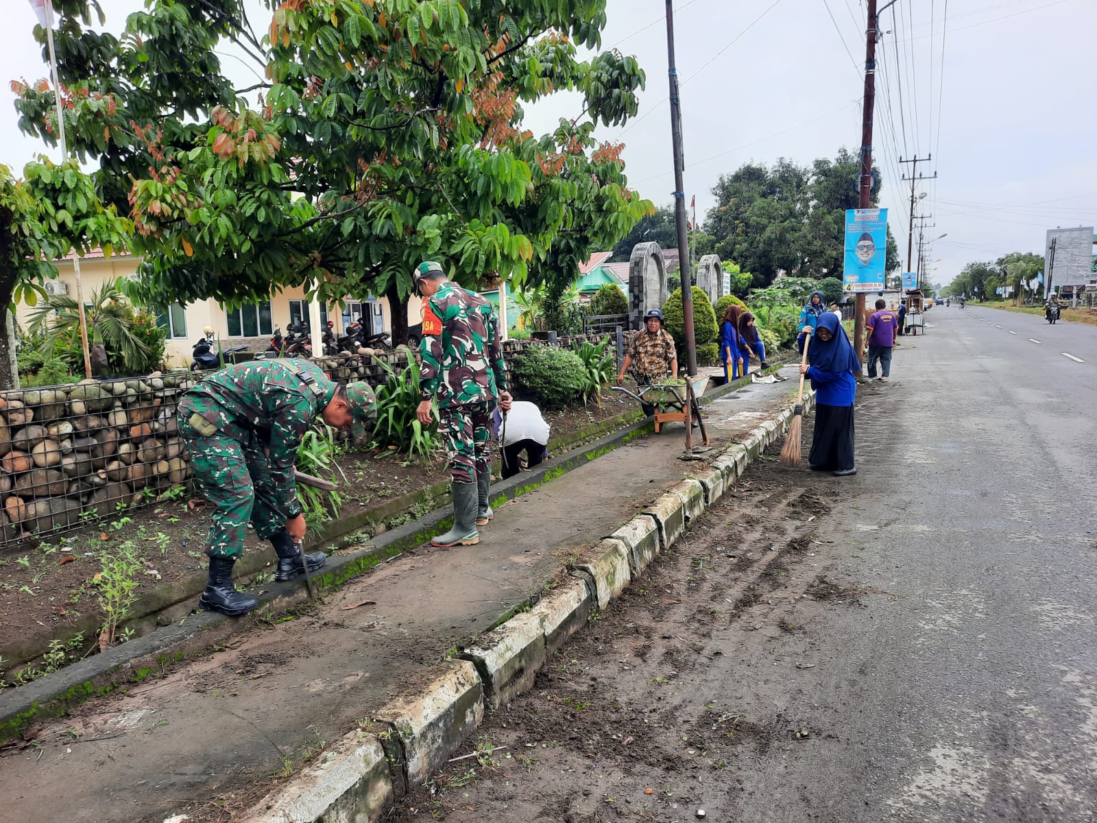 Babinsa Koramil 406-06/Tugumulyo Serka Didik Irawan Melaksanakan Gotong royong Bersama Instansi Pemerintahan Di Kelurahan Srikaton, Kecamatan Tugumulyo, Kabupaten Musirawas .