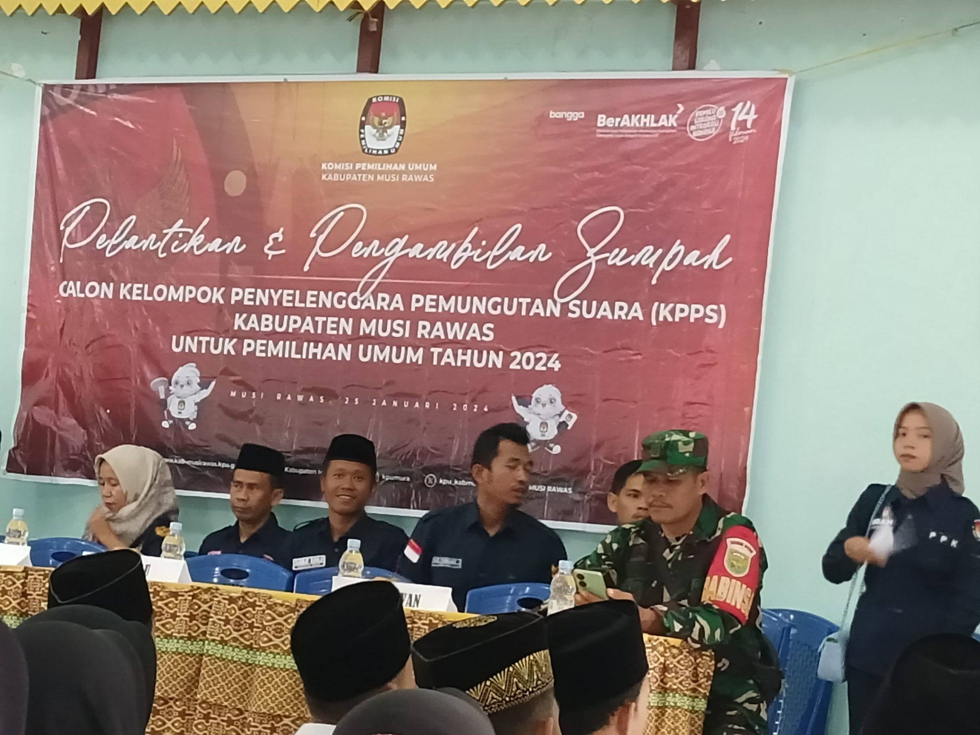 Lensa Garuda- Musi Rawas. Danramil diwakili oleh Babinsa Serka Argani menghadiri pelantikan dan pengambilan sumpah calon kelompok penyelenggara pemungutan suara KPPS kabupaten musi rawas untuk pemilihan umum tahun 2024 se-Kecamatan Tuah Negeri Kabupaten Musi Rawas. Kamis (25/01/2024).