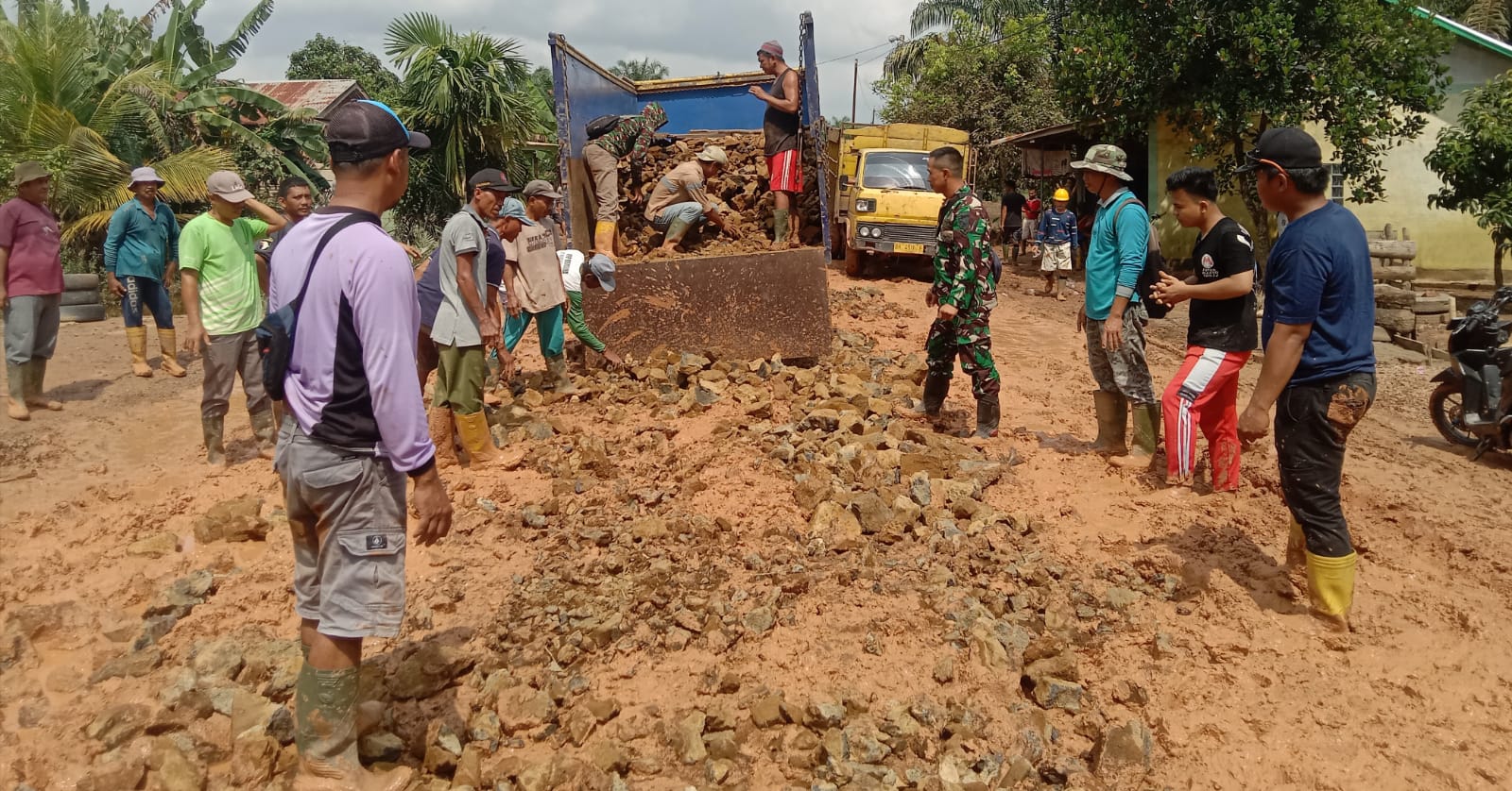 Serda Joni Babinsa Koramil 406-04/Muara Lakitan dan Masyarakat Bekerja Sama Gotong-royong Perbaiki akses jalan yang rusak
