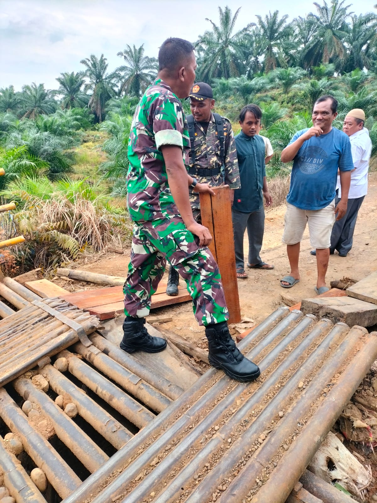 Menanggapi hal tersebut Babinsa Pelda Rohmadani berkoordinasi dengan pihak Pemerintah Desa dan pihak perusahaan untuk bersama-sama memperbaiki jembatan dengan menambahkan kayu di pangkal jembatan agar dapat dilalui kendaraan.