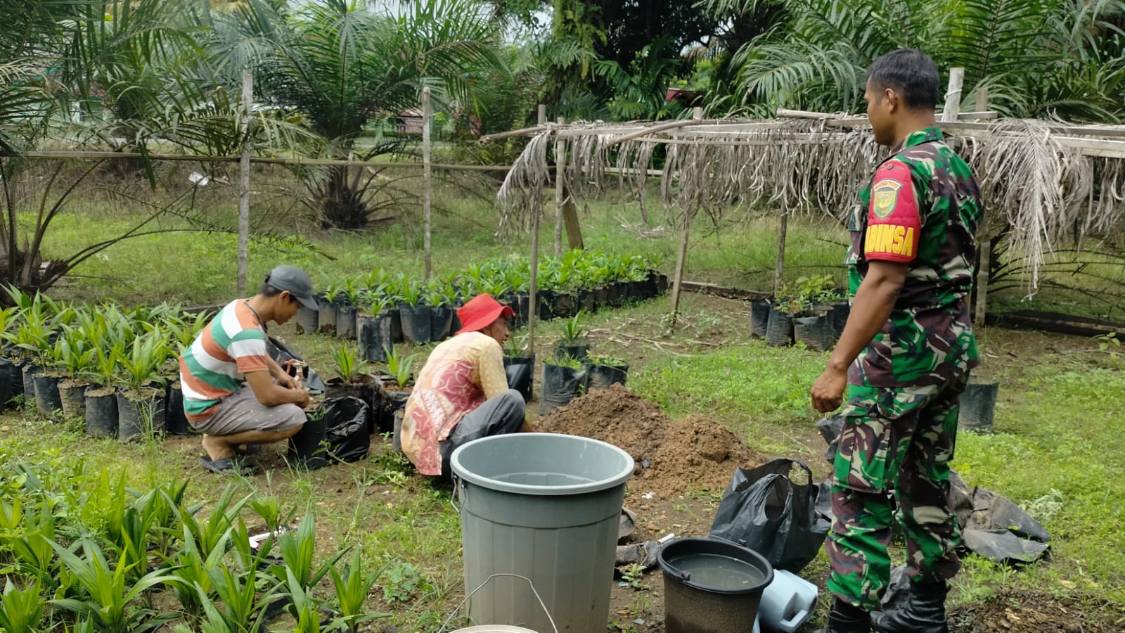 Serda Dimas Prayoga Komsos Dengan bapak Saliman salah satu tokoh masyarakat yang sedang menyemai bibit kelapa sawit bersama istrinya, Serda Dimas menyampaikan kepada bapak Saliman Dan masyarakat agar selalu menjaga Kamtibmas dan kebersihan lingkungan.