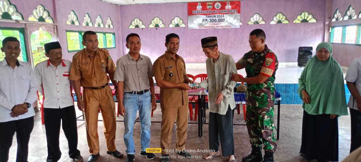Pastikan aman dan tepat sasaran Sertu tugiyanto laksanakan pendampingan pelaksanaan pembagian BLT di desa Wonosari kecamatan Megang sakti kabupaten Musi Rawas. Senin (01/04/2024).